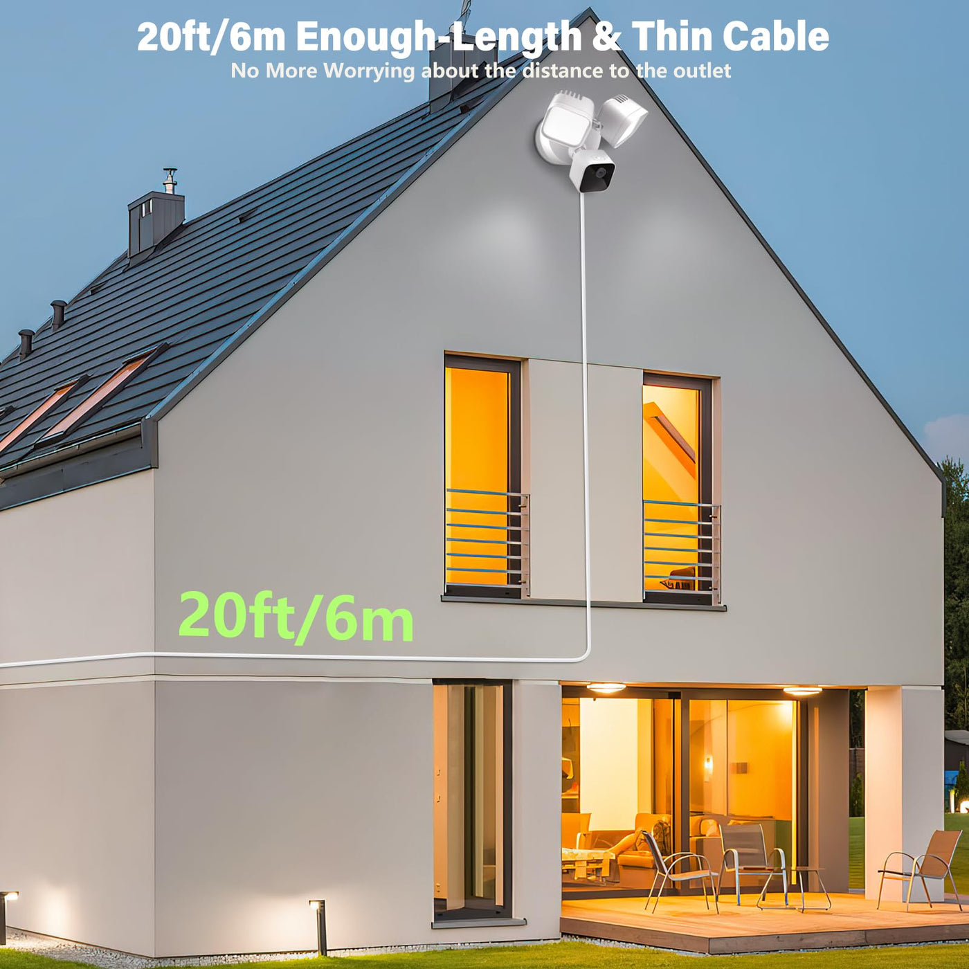 Q: How long is the power cable, and is it suitable for outdoor use?A: The power cable is 20ft (6m) long, providing ample length for flexible placement of your floodlight cam in areas without a junction box or existing outdoor wiring. It is designed to be weatherproof, allowing for safe outdoor use in various weather conditions.
