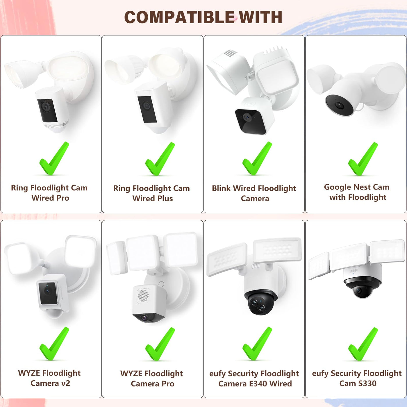 Q: Is this power cable compatible with all floodlight cameras?A: This power cable and plug-in mount are compatible with Floodlight Cam Wired Pro/Plus, Blink Wired Floodlight Camera, Nest Cam with Floodlight, WYZE Floodlight Camera v2/Pro, and eufy Security Floodlight Camera E340 Wired/S330. Please note that the floodlight cameras themselves are not included.