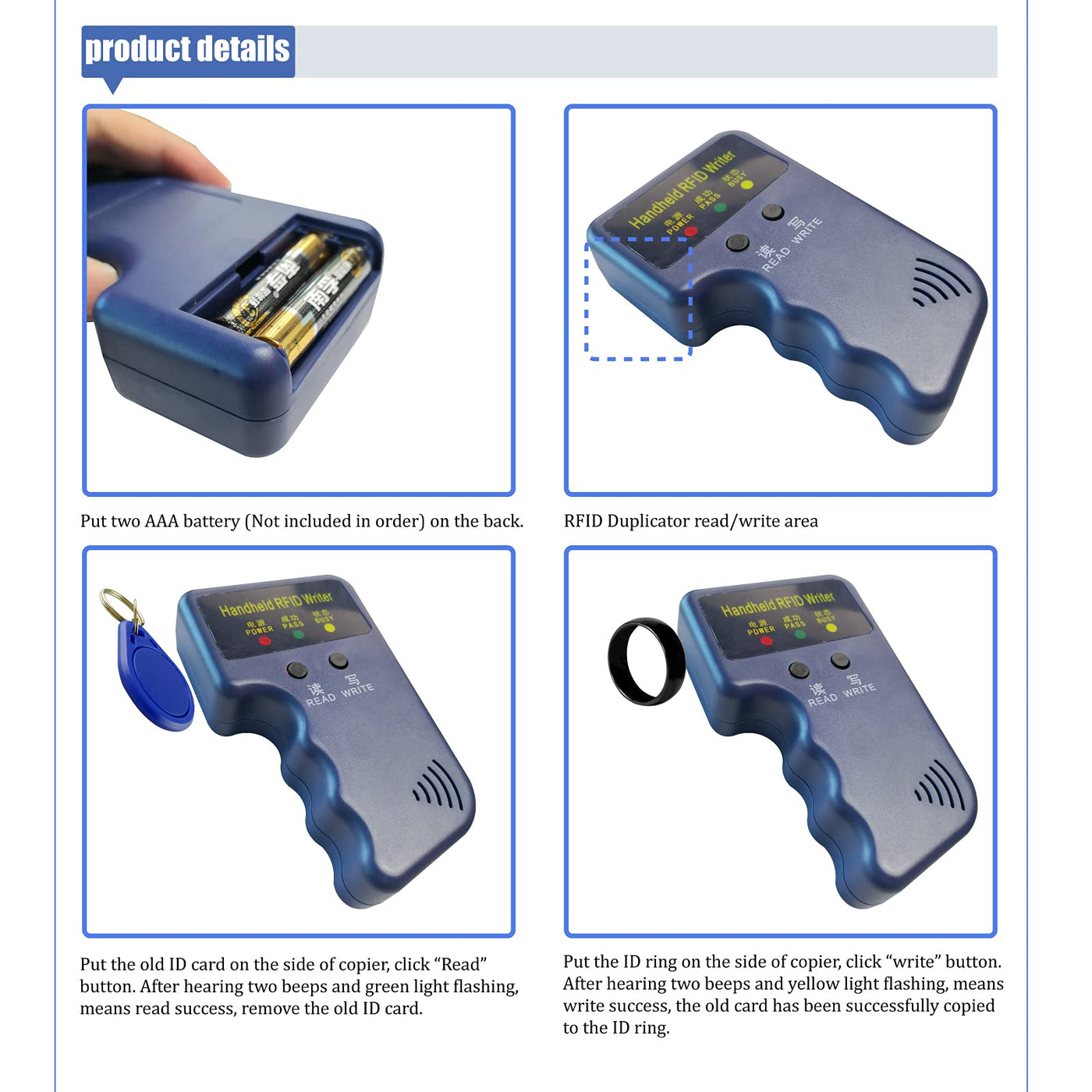 Q: Can I use the RFID ring immediately after purchasing it?A: The ID 125KHz RFID ring is a blank ring and cannot be used directly with access readers or locks without being programmed first. You need to use the included copier to transfer your existing card's UID to the ring. In contrast, the IC 13.56MHz version comes pre-programmed and can be used immediately.