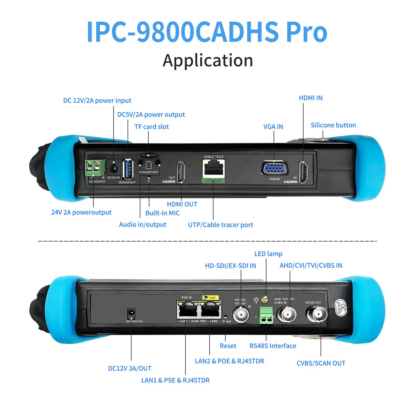 Model: Ipc-9800Cadhs Pro Display 7 Ips Touch Screen, 1280*800 Resolution.Video Modecvbs:1* Bnc Input, 1* Bnc Looped Output, Ntsc/Pal (Auto Adapt).Analog Video, Peak Video, Sync Signal Level, Color Bar Chroma Level Measurement.Ptz Control, Rs485 Control, Baud 600-115200Bps, Compatible With More Than 30 Protocols.Ip Camera Test:4K Ip Discovery/Quick Ovif/Ipc Test /Rtsp Play /Client Apk.Rapid Video:Auto View The Video, Create Testing Report.For Hik And For Dh Camera Test Tool.Ip & Cvbs Test At The Same Time, Converter Test From Analog To Digital With Dual Test Window.Coaxial Hd Camera Test:8Mp Tvi Camera Test, 3840 X 2160P 15 Fps, Utc Control/ Call Osd Menu8Mp Cvi Camera Test, 3840 X 2160P 12.5F/15F,Utc Control/Call Osd Menu8Mp Ahd Camera Test, 3840X2160P 15Fps, Utc Control/Call Osd Menu8Mp Ex-Sdi, Hd-Sdi, 3G-Sdi, Utc Control & Call Osd Menu. Upgraded Digital Cable Tracer: Search Bnc Cable, Network Cable And Telephone Cable From The Mess Cables, More Accurately.Pd Power Test. Ac Voltage Detector.Otherspower: Input Dc12V/2A; Output Dc24V/2A, Dc12V/3A, Dc5V/2A & Poe Ieee802.3Af/At Max 25.5W. Battery: Built-In 7.6V Battery, 7800Mah/59.28Wh.Normal Working 15H.Network Test: Trace Route, Link Monitor, Dhcp Server, Port Flashing, Ping Test.1 Hdmi Input, 1 Hdmi Output. Audio Test, Data Monitor, Poe Test.Language: English, Chinese, Korean, Russian, Italian, French, Polish, Spanish, Japanese.Working Temperature: -10~50C, Humidity 30%-90%.Dimension/Weight: 240Mmx154Mmx46Mm/0.7Kg(1.6Lbs)