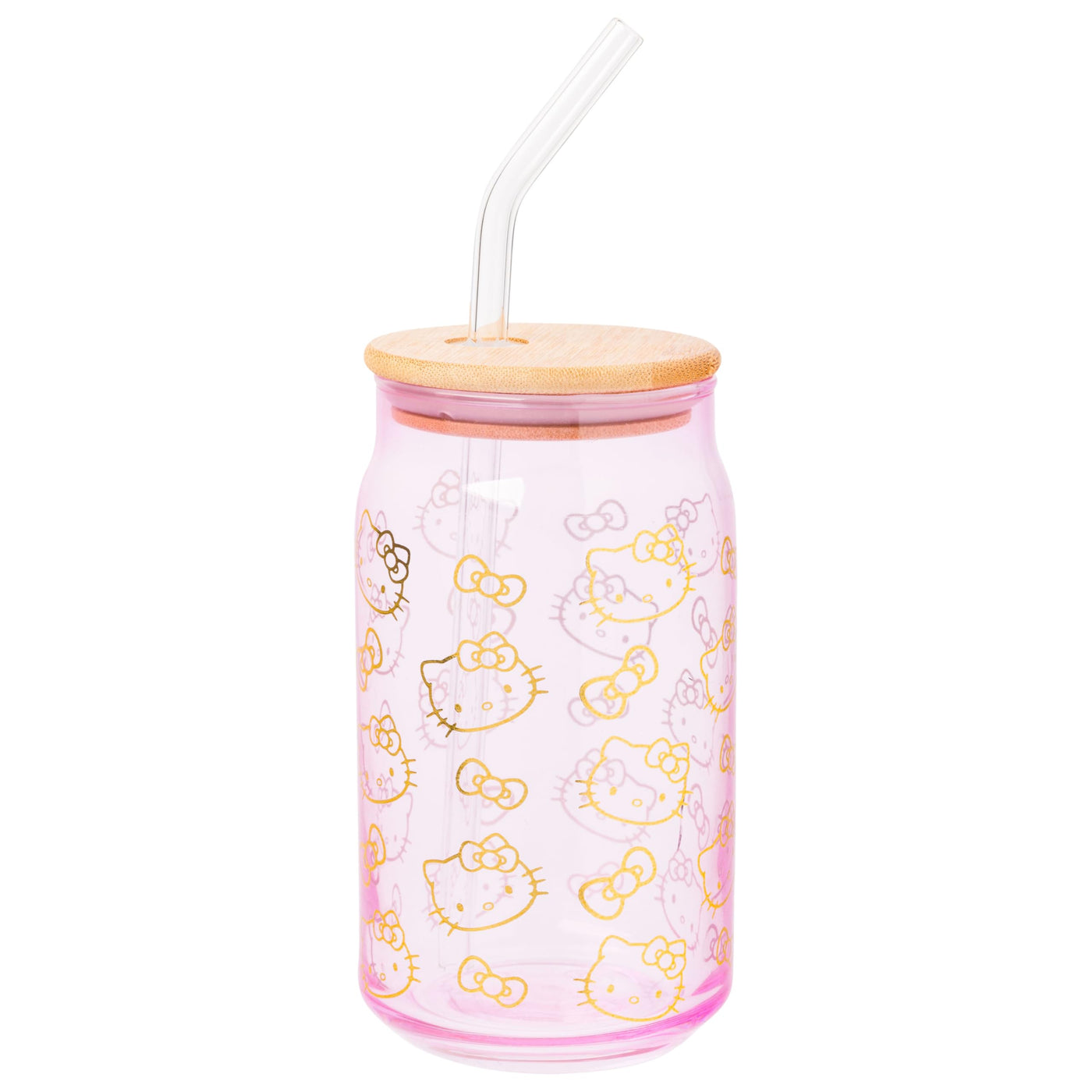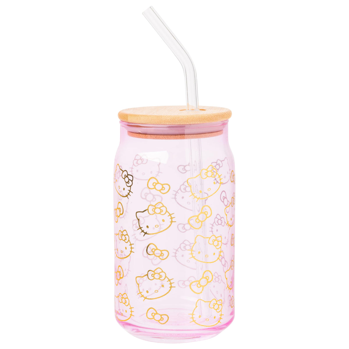 Silver Buffalo Sanrio Hello Kitty Gold 2 Pack Pink Glass Jar Tumbler With Bamboo Lid And Glass Straw, 16 Ounces