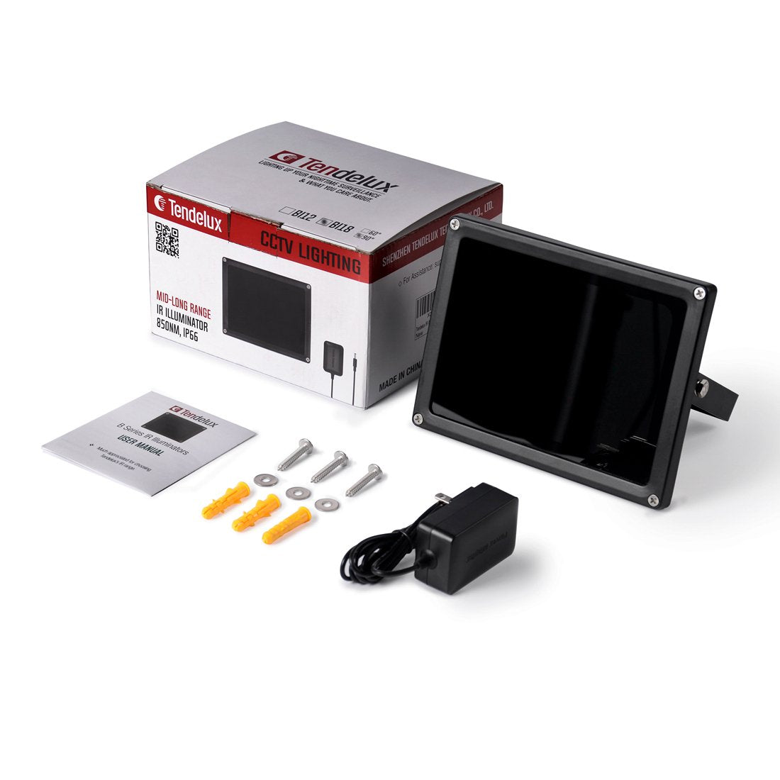 Q: What type of power supply does the Tendelux IR illuminator require?A: The Tendelux BI18 IR illuminator operates with a plug-and-play 12VDC 2A power supply, which is included in the package.