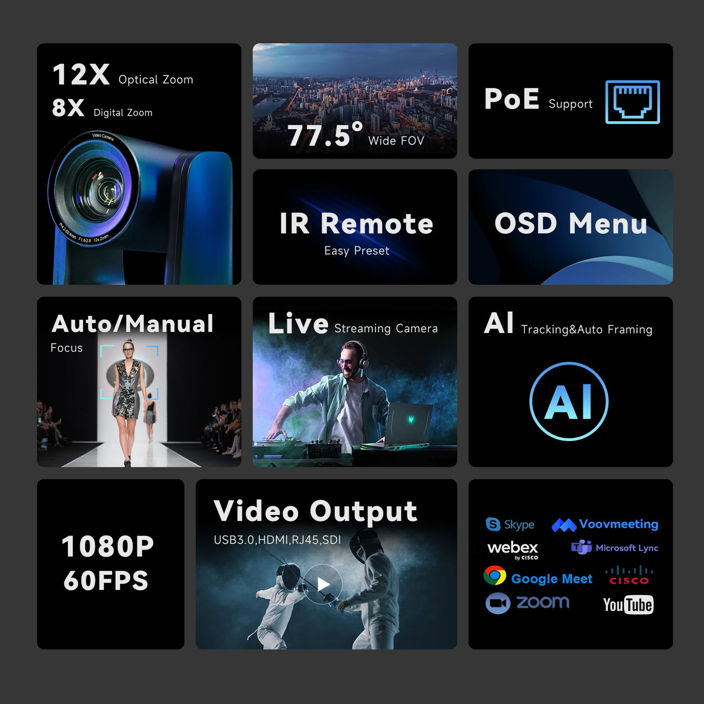 Tenveo Ptz Camera Ai Auto Tracking Live Streaming 12X Optical Zoom Sdi/Hdmi/Usb/Rj45 Video Conference Room Camera Fhd 1080P 60Fp