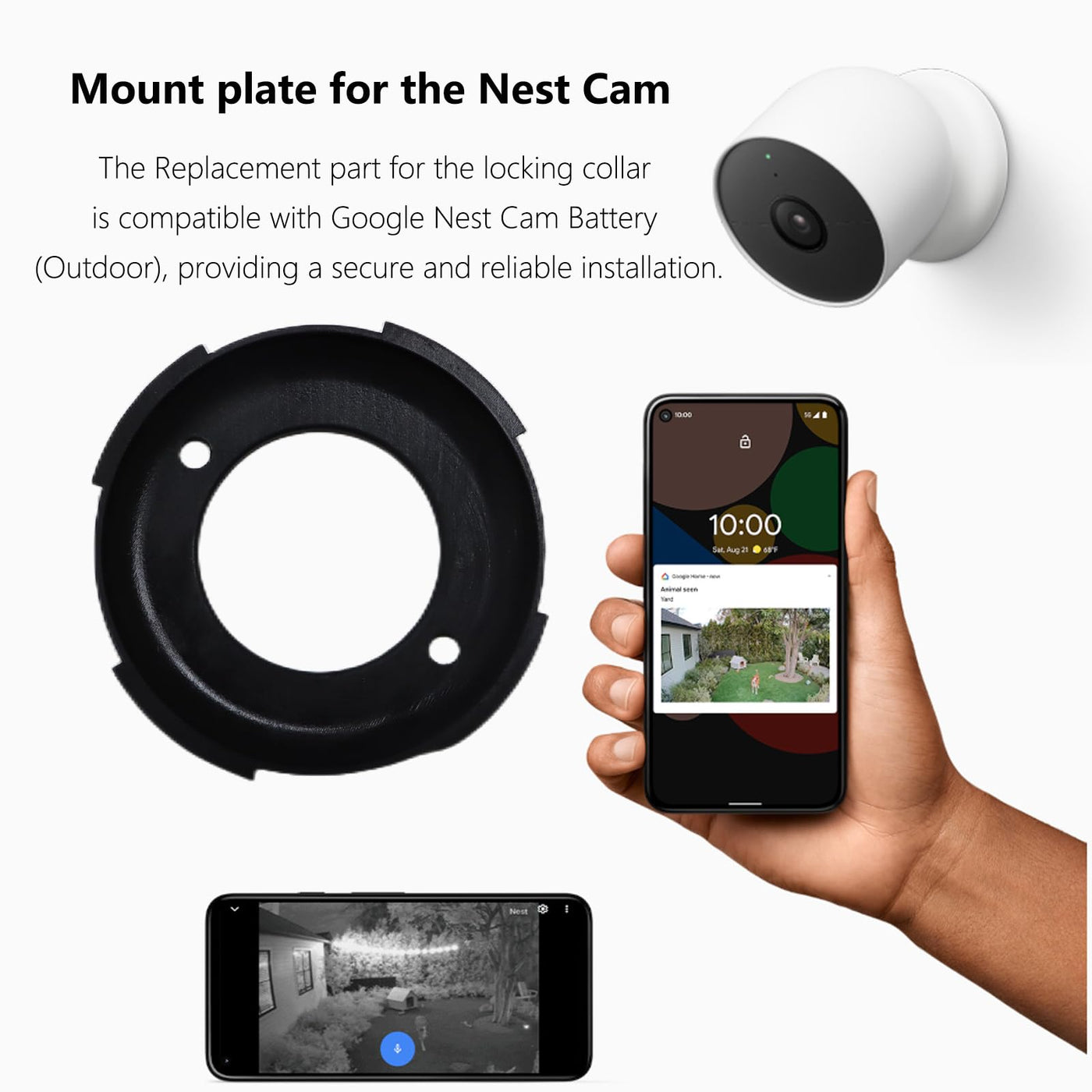 Q: Is this mounting plate compatible with the Google Nest Cam Outdoor (Battery)?A: Yes, this mounting plate is specifically designed as a replacement part for the locking collar of the Google Nest Cam Outdoor (Battery), ensuring a perfect fit and seamless functionality.