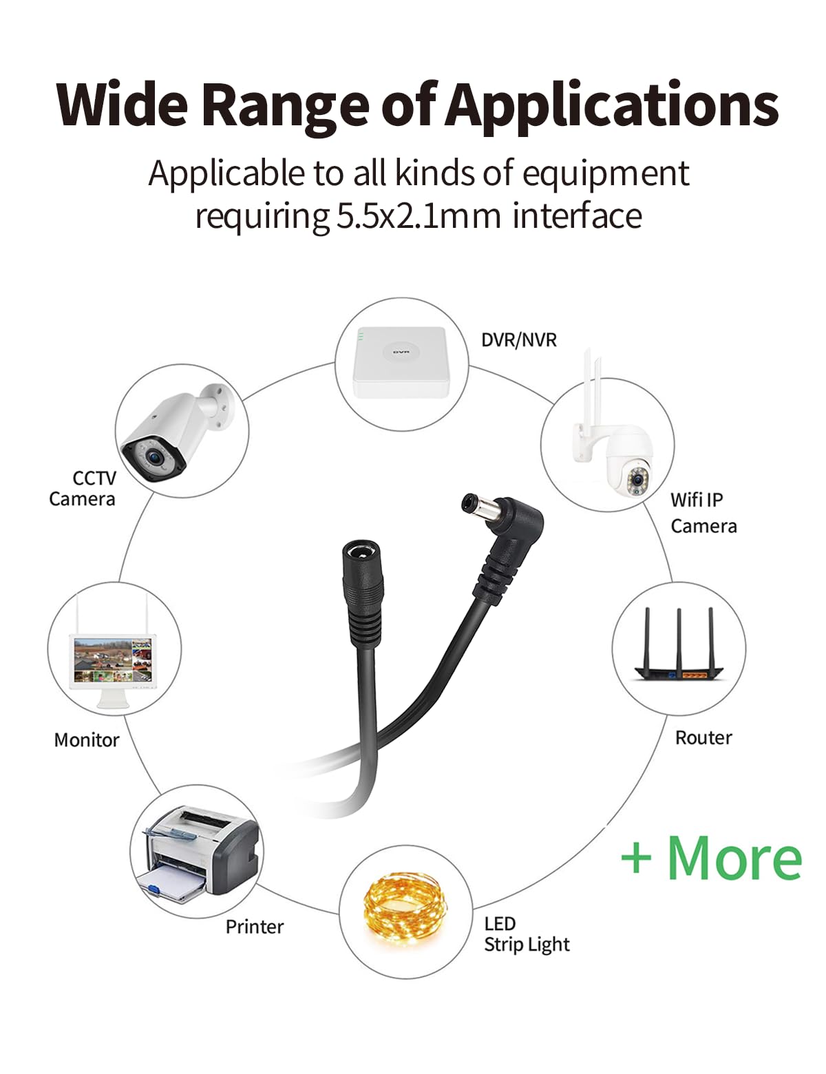 Q: What is the significance of the 90-degree connector on the Tonton DC Power Extension Cable?A: The 90-degree connector on the Tonton DC Power Extension Cable allows for better space management and easier installation in tight areas, ensuring a secure and tidy setup for your devices.