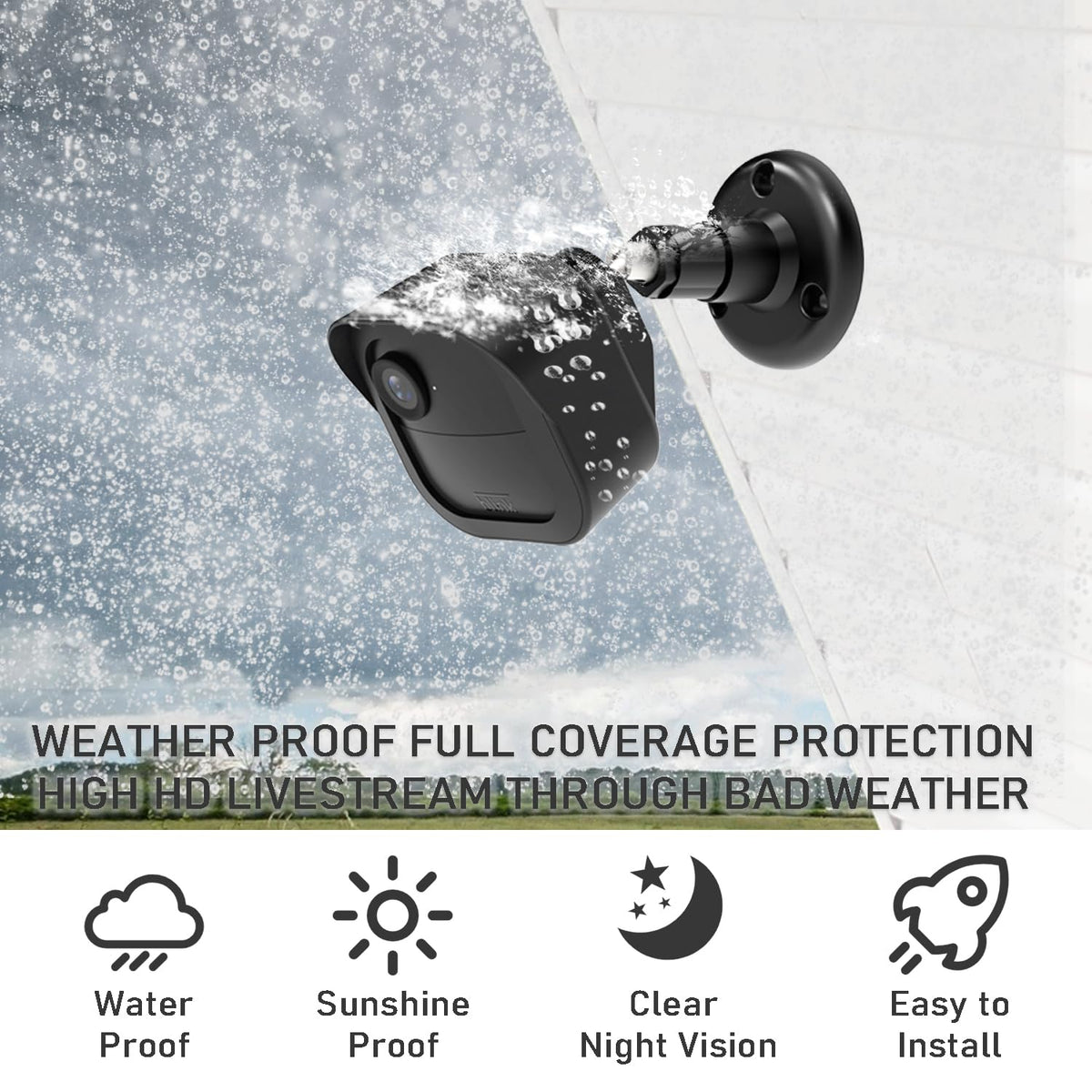 Q: Is the ULIOLI Blink Outdoor Camera Mount weatherproof?A: Yes, the mount is made from premium ABS material, ensuring it is weatherproof and protects your Blink camera from potential damage caused by outdoor elements.