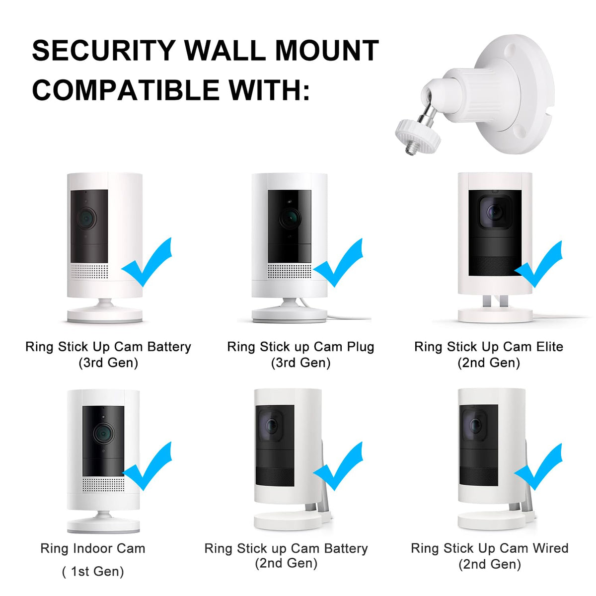 Q: Is this wall mount compatible with various Ring camera models?A: Yes, this wall mount is compatible with multiple Ring camera models including the Ring Indoor Cam (1st Gen), Ring Stick Up Cam Elite (2nd Gen), Ring Stick Up Cam Battery (3rd Gen), and Ring Stick Up Cam Plug-in (3rd Gen). It also works with other security cameras that have a 1/4” screw connector, like Arlo and Wyze cameras.