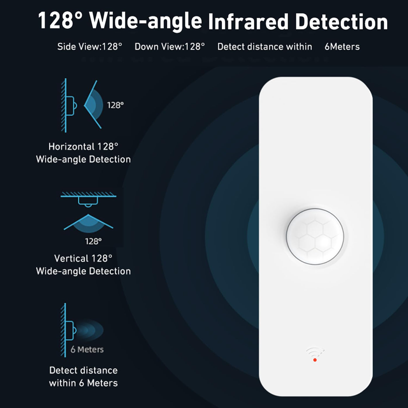Q: How does the WiFi PIR Motion Sensor work?A: The WiFi PIR Motion Sensor uses dual-element infrared technology to detect movement within a range of 6 to 40 feet at a detection angle of 128 degrees. When motion is detected, it sends real-time notifications to your smartphone via the Tuya Smart or Smart Life app, allowing you to monitor activity remotely.