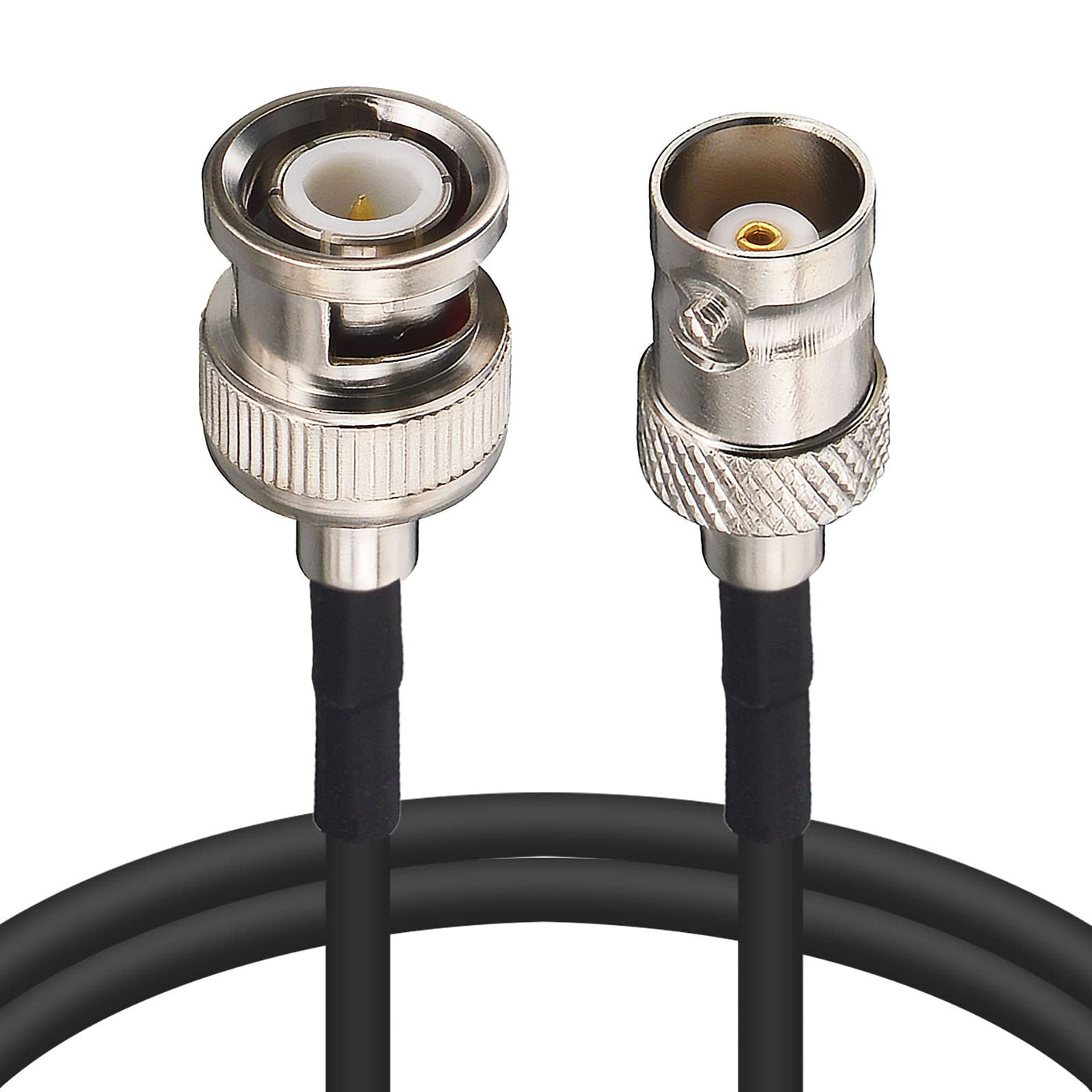 Q: What are the specifications of the connectors on this cable?A: The cable features a BNC Male Plug with a pin inside on one end and a BNC Female Jack with a pin inside on the other end, ensuring a secure and reliable connection.