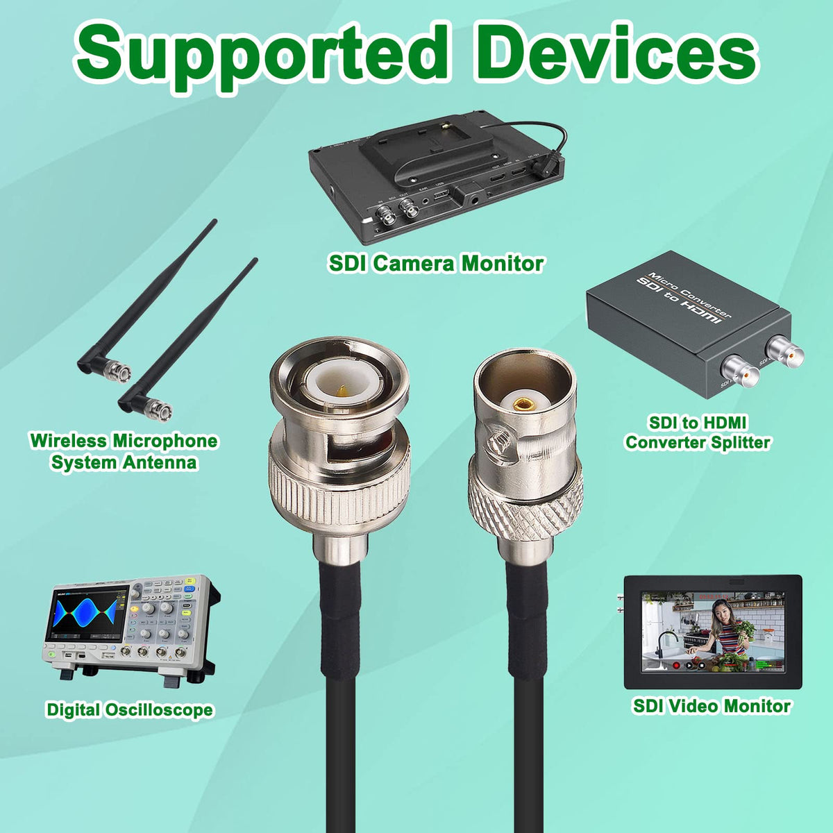 Q: Is the YOTENKO BNC cable compatible with SDI video equipment?A: Yes, this BNC cable is compatible with various SDI video equipment, including 1080P SDI Video Monitors, SDI Video Cameras, and SDI Recorders. It supports the transfer of HD video signals.