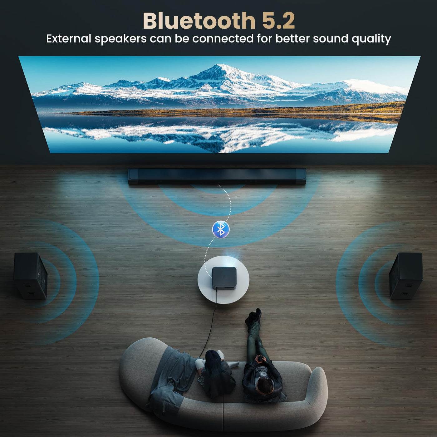 Q: What audio capabilities does the projector offer?A: The HAPPRUN projector comes with a built-in 8W HiFi audio system that delivers high-quality sound without needing additional speakers. It also features bidirectional Bluetooth 5.2, allowing you to connect external speakers for an enhanced audio experience or use the projector as a Bluetooth speaker to play music from your devices.