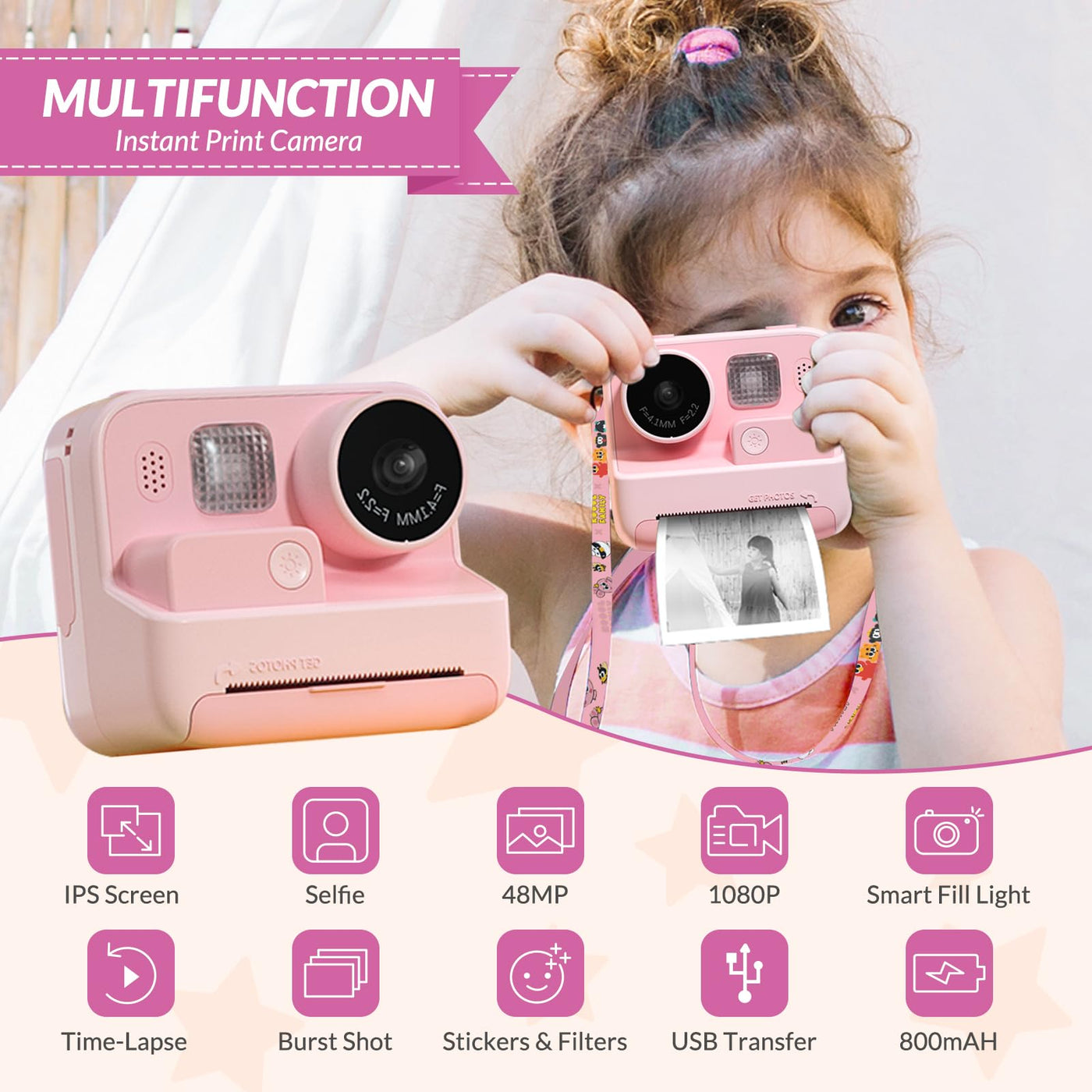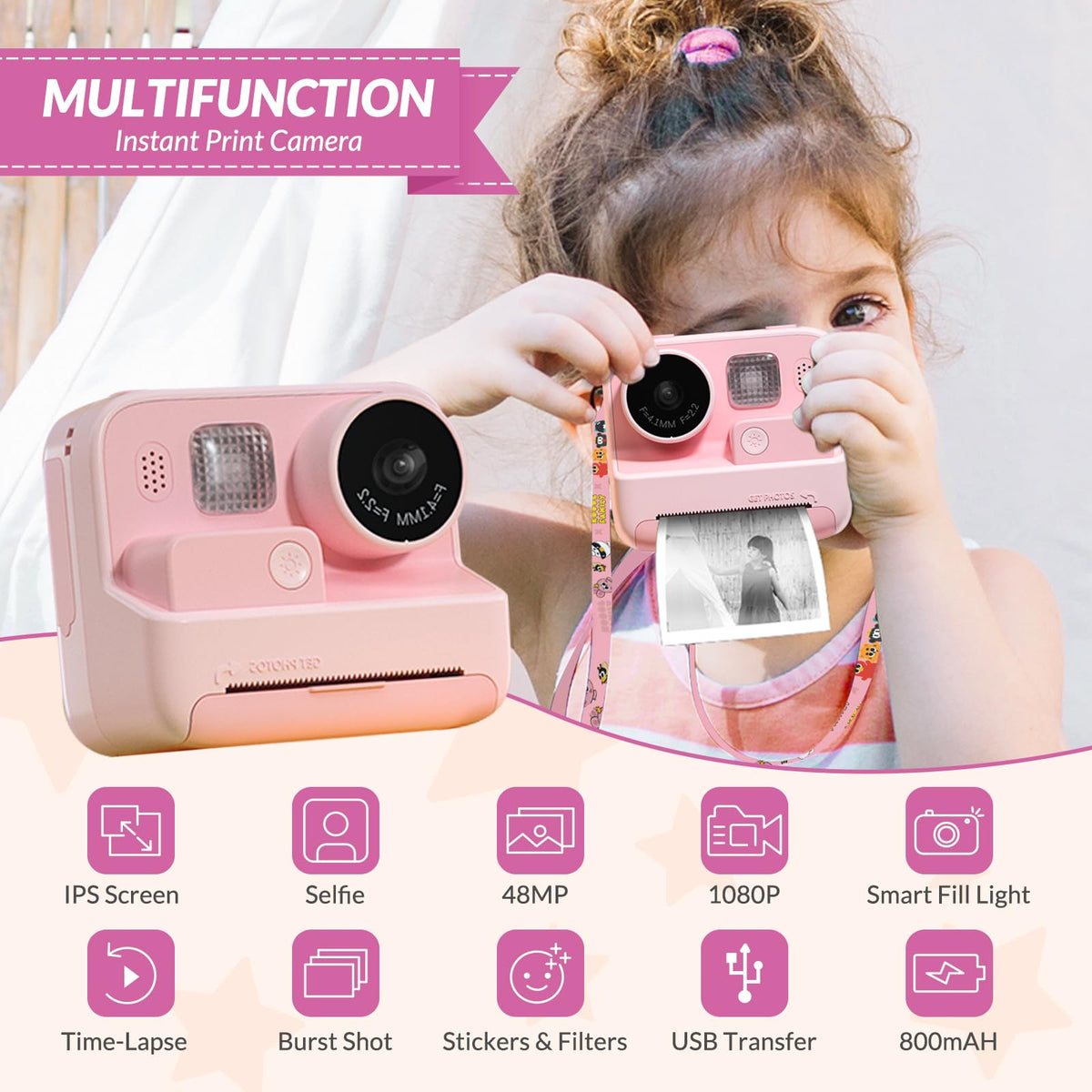 Kids Instant Print Camera, No Ink: Kids Instant Camera Adopts Thermal Printing Technology. Press A Key To Print The Photos With No Ink Cartridges And Toners. 3 Rolls Of Printer Paper, For Up To 180 Pictures, Is Bpa-Free, Skin-Friendly And Easy To Replace. 2 Inch Ips Screen Is Better To Care Your Childs Eyes. All Is For Children
