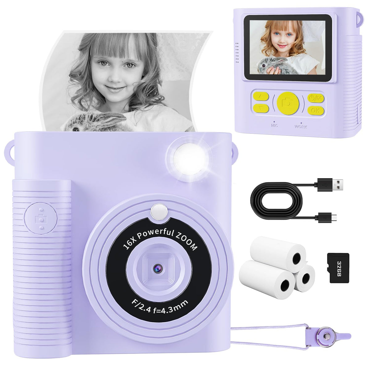 Kids Camera,Instant Print Camera For Kids,1080P Hd Digital Camera With 32G Sd Card,3 Rolls Photo Paper & 6 Color Pens, For 3-14 Year Old Girls (Purple)