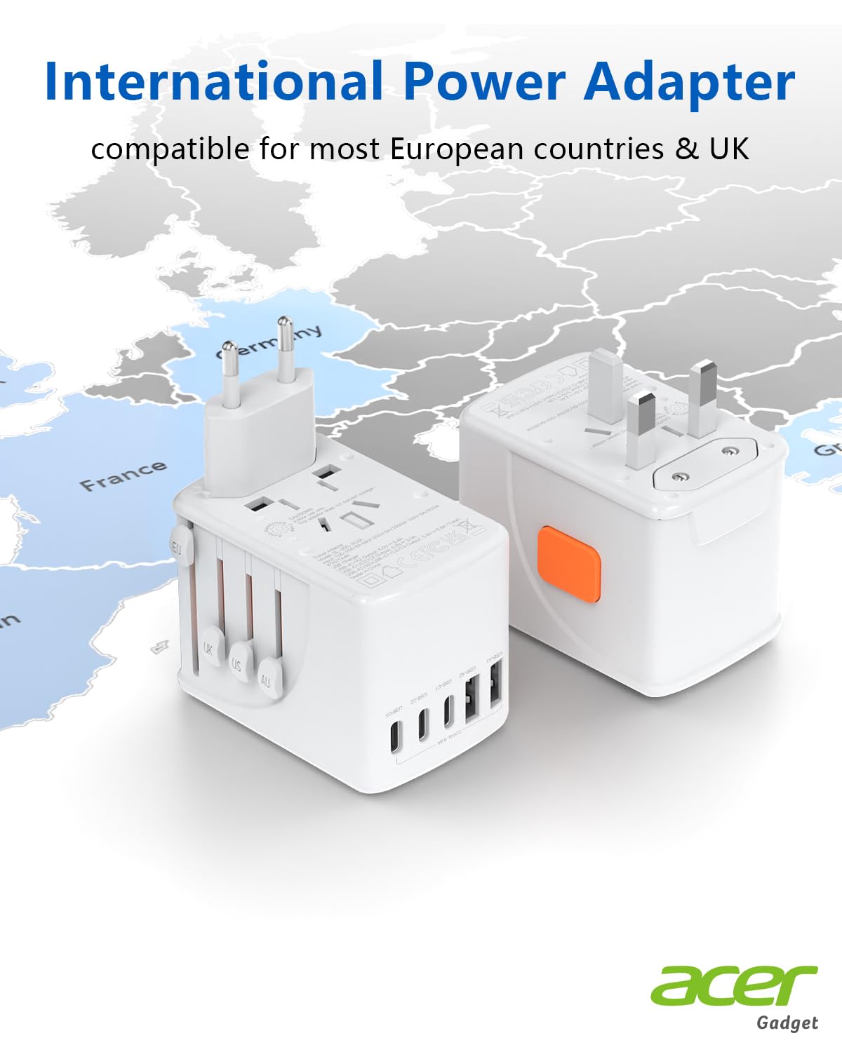 Product Title: Acer Universal Travel Plug Adapter - International Power Adapter With 5 Usb Ports (3 Usb C) 5.8A, Worldwide Outlet Charger For Usa To European Uk France Germany Spain, Type C/E/F/G/I/L/A, Black ?6-In-1 Universal Travel Adapter? This International Power Adapter Has 5 Usb Ports(29W) And A Universal Ac Outlet Which Accpet Plugs Of Us, Eu, Uk, Au, So You Can Simultaneously Charge 6 Of Your Electronics Such As Iphones, Laptops, Tablets, Power Banks, Cameras, Earbuds. This Travel Adapter Worldwide Ensures Seamless Connectivity On Your Worldwide Adventures. ?5 Usb-C International Power Adapter? The 3 Usb C Ports Of Travel Adapter Can Charge Up To 3.0A/15W, And The 2 Usb A Ports Can Charge Up To 2.4A/12W, So This Power Adapters For International Travel Is Ideal For Your Usb Devices, Especially Laptop, Smartphone, Tablet, Camera, Etc. Universal Adapter'S Max Output Of For All The Usb Ports Is 5.6A/28W Max ?Universal Travel Adapter Worldwide? This Travel Adapter Worldwide Covers Over 150 Countries: France, Germany, Italy, Spain, Iceland, Greece, Israel (Type C ); Uk, Ireland, London, England, Scotland, Dubai (Type G); China, Australia, New Zealand (Type I); Usa, Japan, Canada (Type A), And More, International Plug Adapter Suitable For Your Worldwide Traveling ?Not A Voltage Converter? This Universal Power Adapter Does Not Convert Voltage But Only Plug Type And It May Not Be Suitable For Use Appliances That Only Accept 110V Input Voltage Such As Hair Dryers, Curling Irons, Straighteners, And Other Similar Devices. Ensure To Check If Your Us Appliance Support Dual Voltage (100V-250V) For Safety Use. ?European River Cruising Must-Haves? This European Travel Plug Adapter Has No Surge Protection, Nor Cords, Thus Type C Adapter Can Be Taken Aboard Cruise Ship. Measured At 2.0?2.2?3.0 Inch, This Compact Adapter For Europe Plug Fit Easily Into Your Luggage Or Backpack.&Nbsp;
