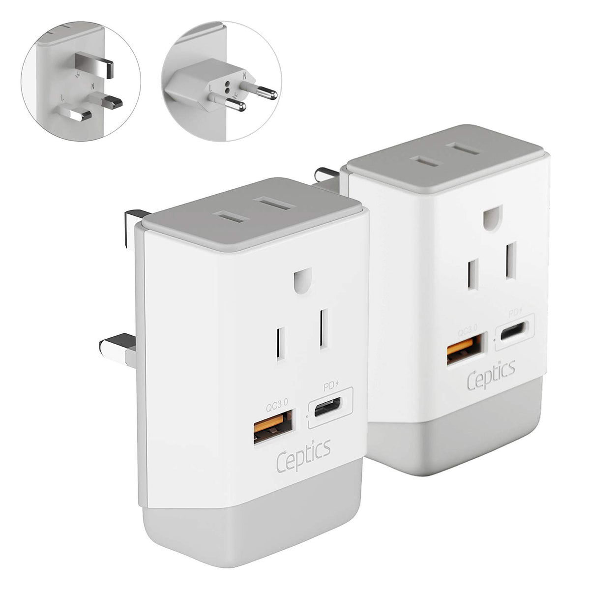 Ceptics European Plug Adapter 2 Pack Set, Qc 3.0 & Pd, Safe Dual Usb & Usb-C - 2 Usa Socket - Compact & Powerful - Type C (Europ