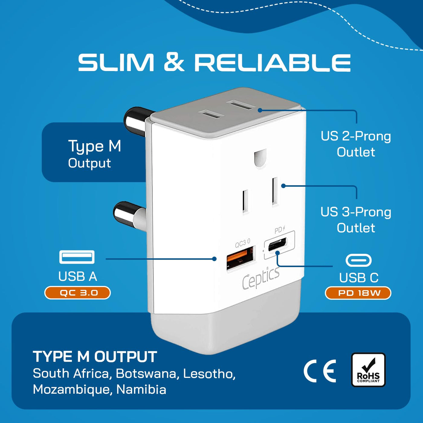Ceptics South Africa Power Plug Adapter Travel Qc 3.0 & Pd, Safe Dual Usb & Usb-C - 2 Usa Socket Compact & Powerful - Use In S.