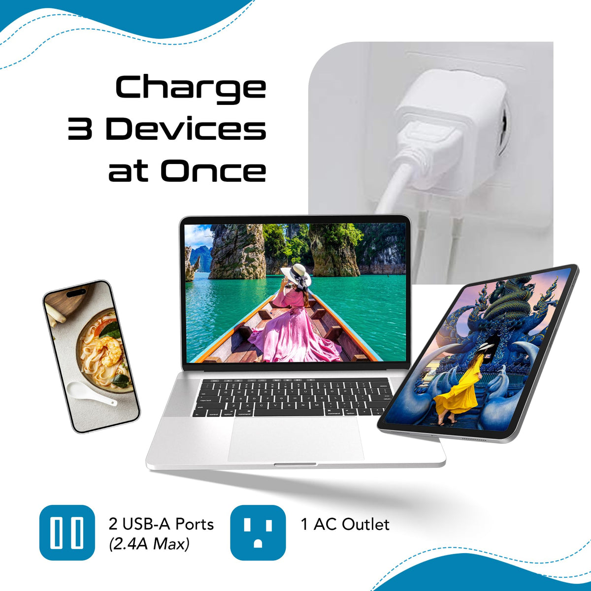 Q: What devices can I charge with the Ceptics Thailand Travel Adapter?A: The Ceptics Thailand Travel Adapter features dual USB ports, allowing you to charge various devices such as cell phones, laptops, and cameras. It supports a charging capacity of up to 2.4A, making it ideal for high-demand devices like iPhones and iPads.