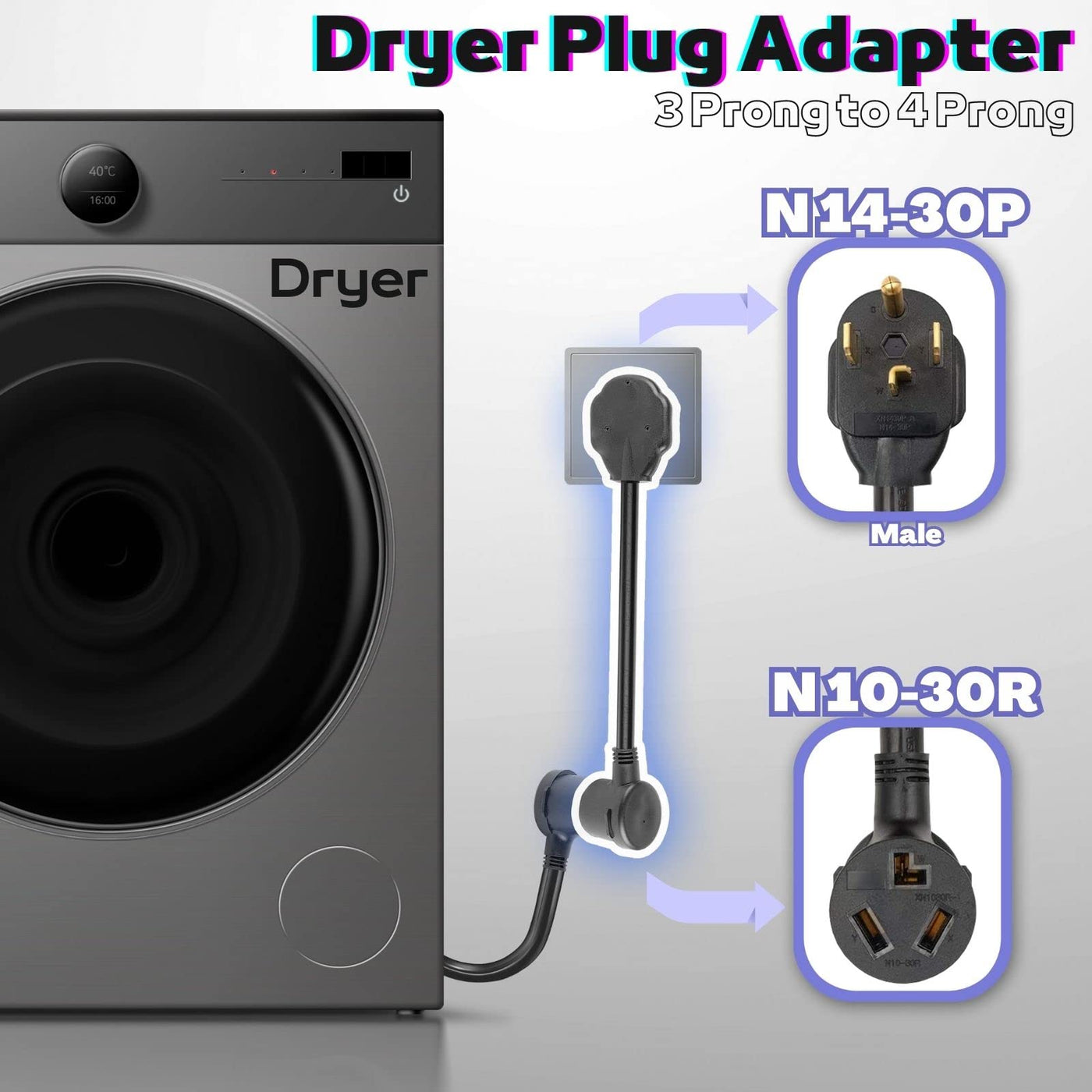 Q: What is the purpose of the Dryer Adapter Cord?A: The Dryer Adapter Cord is designed to convert a 3-prong plug (NEMA 14-30P) from older dryers and washing machines to a 4-prong plug (NEMA 10-30R) for newer models, allowing for compatibility with different electrical systems.
