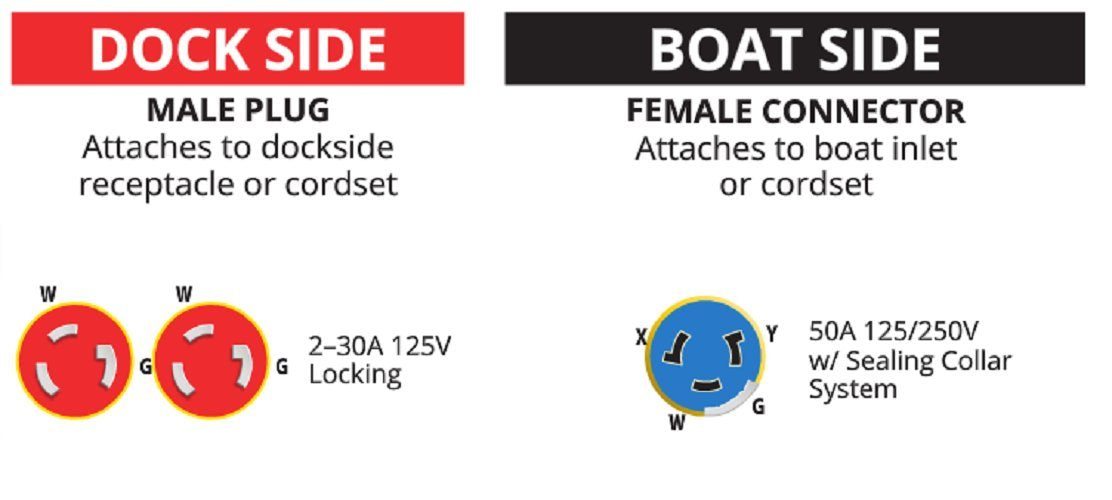 The Reverse ''Y'' Adapter Has Two Male Plugs With Special Power Isolation Circuitry For Added Safety. They Provide 50A 125/250V Power When Only Two 30A 125V Receptacles Are Available. Reverse ''Y'' Adapters Are Fully Molded And Equipped With The Marinco Unique Sealing Collar And Covers (Where Indicated) For Use In Wet Locations.