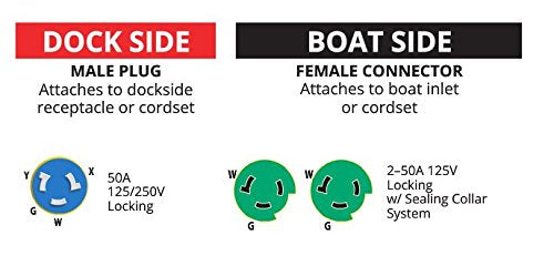 Eel Y Adaptersthese Adapters Are Equipped With Sealing Collars And Are For Use In Wet Locations.Boat Sidefemale Connector: Attaches To Boat Inlet Or Cordset(2)50A-125V Locking W/ Sealing Collar Systemdock Sidemale Plug: Attaches To Dockside Receptacle Or Cordset(1)50A-125/250V Locking Warning: This Product Can Expose You To Chemicals Including Di(2-Ethylhexyl)Phthalate (Dehp) Which Is Known To The State Of California To Cause Cancer, Birth Defects Or Other Reproductive Harm. For More Information Go To P65Warnings.Ca.Gov.