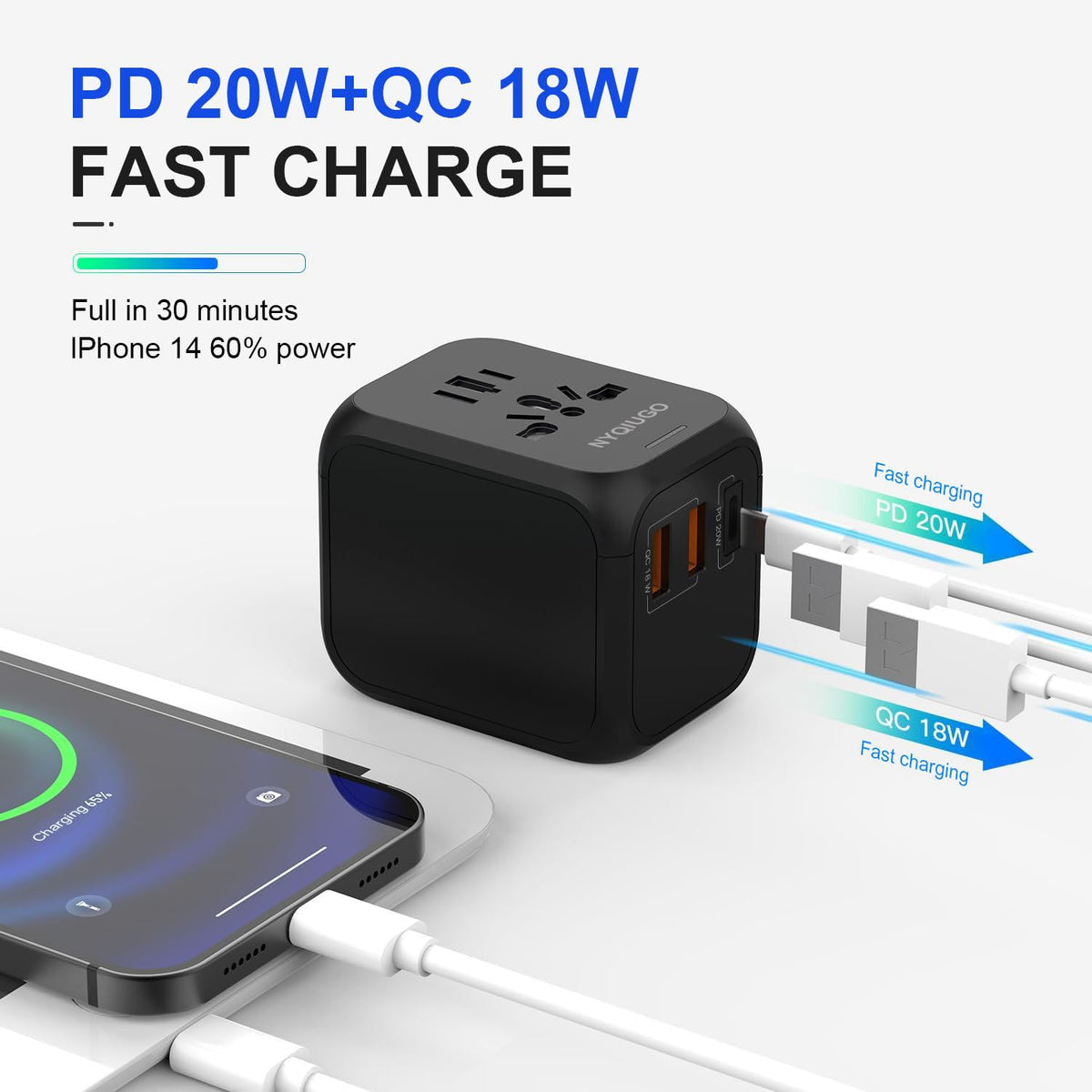 Q: How fast can this adapter charge my devices?A: The NYQIUGO adapter supports PD 3.0 and QC 3.0 fast charging protocols, allowing you to charge your iPhone 13 up to 50% in just 30 minutes. It delivers a total of 20W for rapid charging.