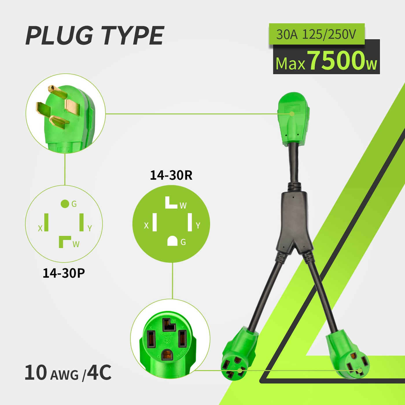 Q: What type of plug and receptacles does the RVMATE Dryer Splitter use?A: The RVMATE Dryer Splitter features a NEMA 14-30 male plug and two NEMA 14-30 female receptacles, allowing you to connect multiple appliances safely.