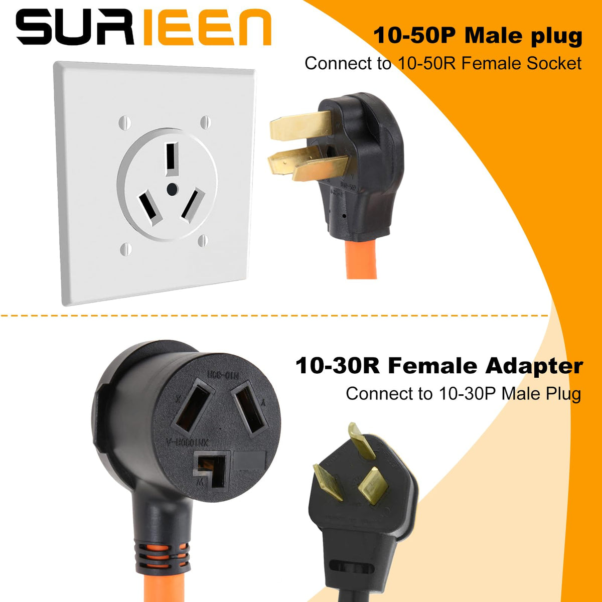 Surieen Nema 10 50P Male To 10 30R Female Dryer Plug Adapter, 1.5Ft 3 Prong To 3 Prong Dryer Adapter Cord, 50 Amp Dryer Male Plu