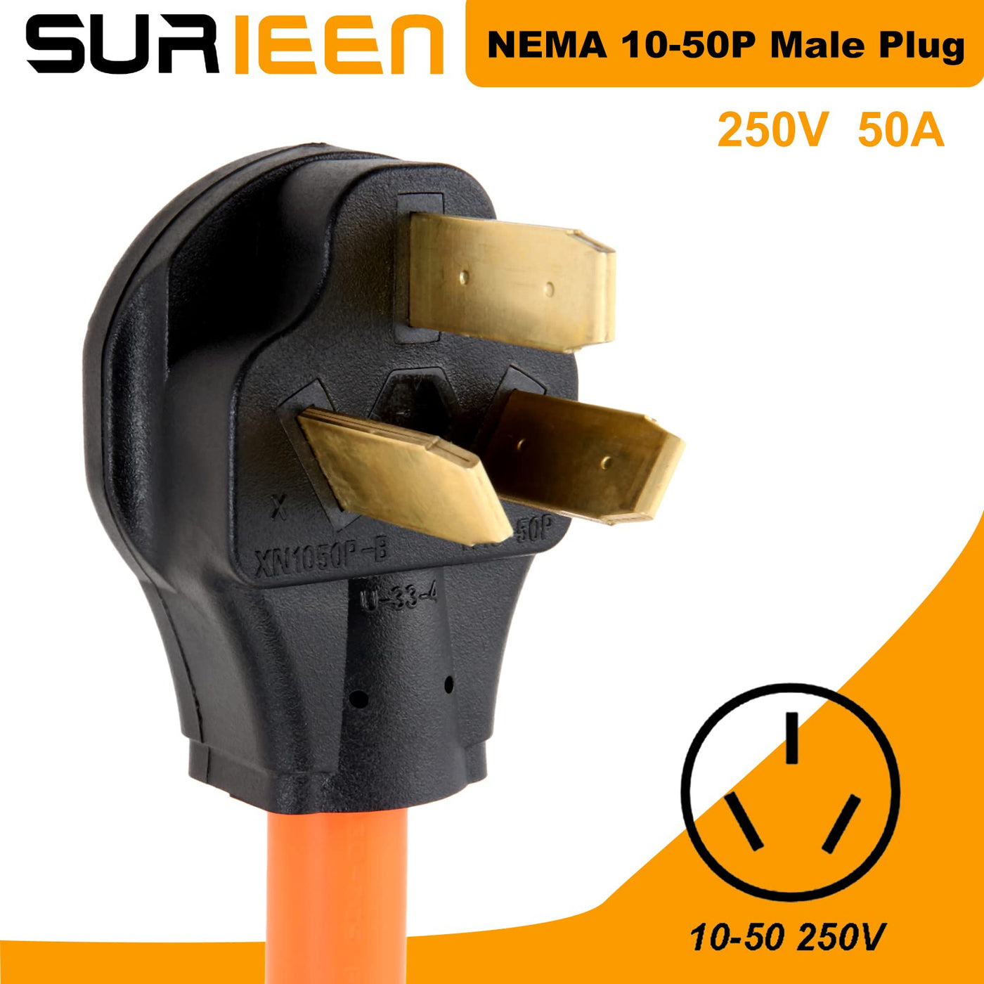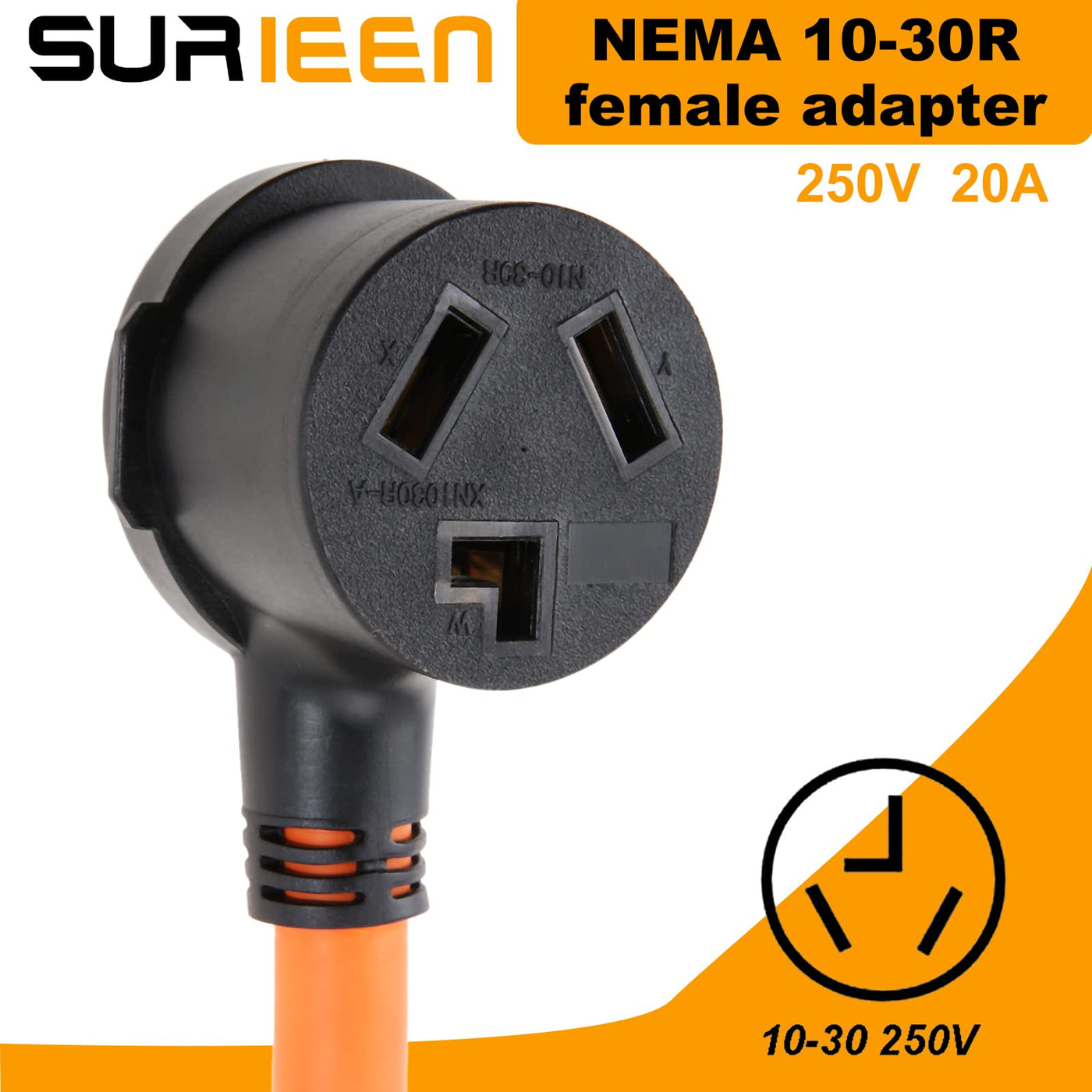 Q: What is the amperage and voltage rating of the SURIEEN NEMA 10-50P to 10-30R dryer adapter?A: The SURIEEN dryer adapter features a 50 Amp male plug (10-50P) and is designed for a 20 Amp female socket (10-30R), operating at a voltage of 250V.