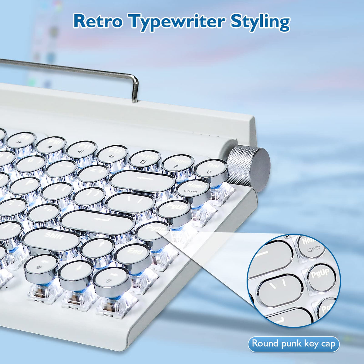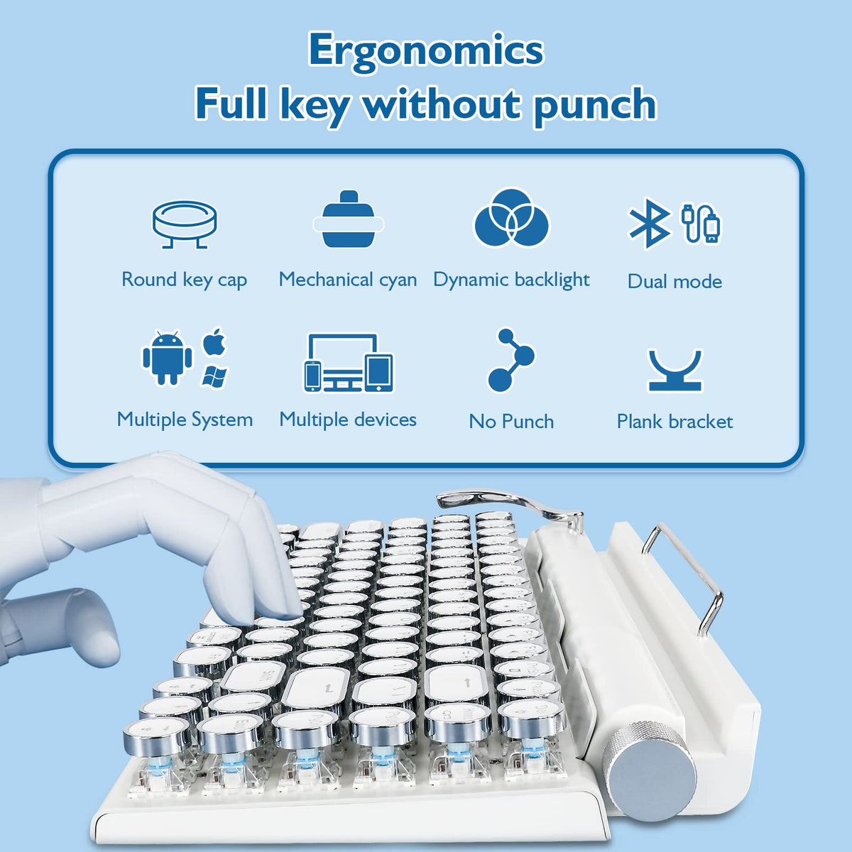 Note: Black Models Are Rgb Backlit, Other Models Are White Backlit. All Support A Variety Of Cool Lighting Modesclassic Punk Keycaps Nostalgic Keycaps, Handmade Keycaps Are Assembled From Two Parts. Metal Panel White Is One Of The Classic Colors Of Typewriters, With Multiple Backlight Effects, Durable And Stylish Practical Mobile Phone Stand Design Support Multiple Device Connections, Including Mobile Phones, Tablets And Laptops, And Able To Switch Quickly Bluetooth 5.0 Connect Devices Faster And More Stable Support Wired And Wireless Bluetooth Connection High-Quality Hot-Swappable Blue Switch High-Quality High-Quality Mechanical Switch With Stable Quality .Support To Replace The Shaft Body To Create Your Own Typewriter Keyboard