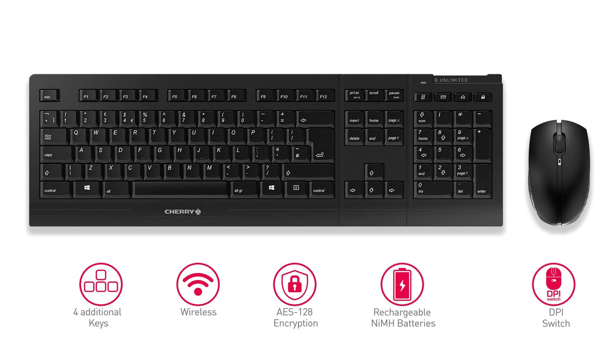 Do You Attach Great Importance To Straightforward Design, Standardized Layout And Perfect Typing Feel? Then This Wireless Desktop Is Just Right For You. The Cherry B.Unlimited 3.0 Transmits Data With 2.4 Ghz Radio Transmission Up To 10M Away And Avoids Cable Tangle On Your Desk. The Included Keyboard For Pc, Notebook Or Tablet Convinces With Its High-Quality Cherry Sx Scissor Mechanism. This Technology Offers An Excellent Tactile Writing Feel With A Short Keystroke And A Long Service Life (Over 10 Million Keystrokes Per Key). A Built-In Metal Plate Gives The Reliable Keyboard Weight And Stability.