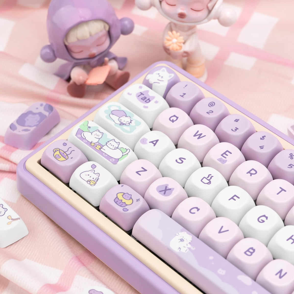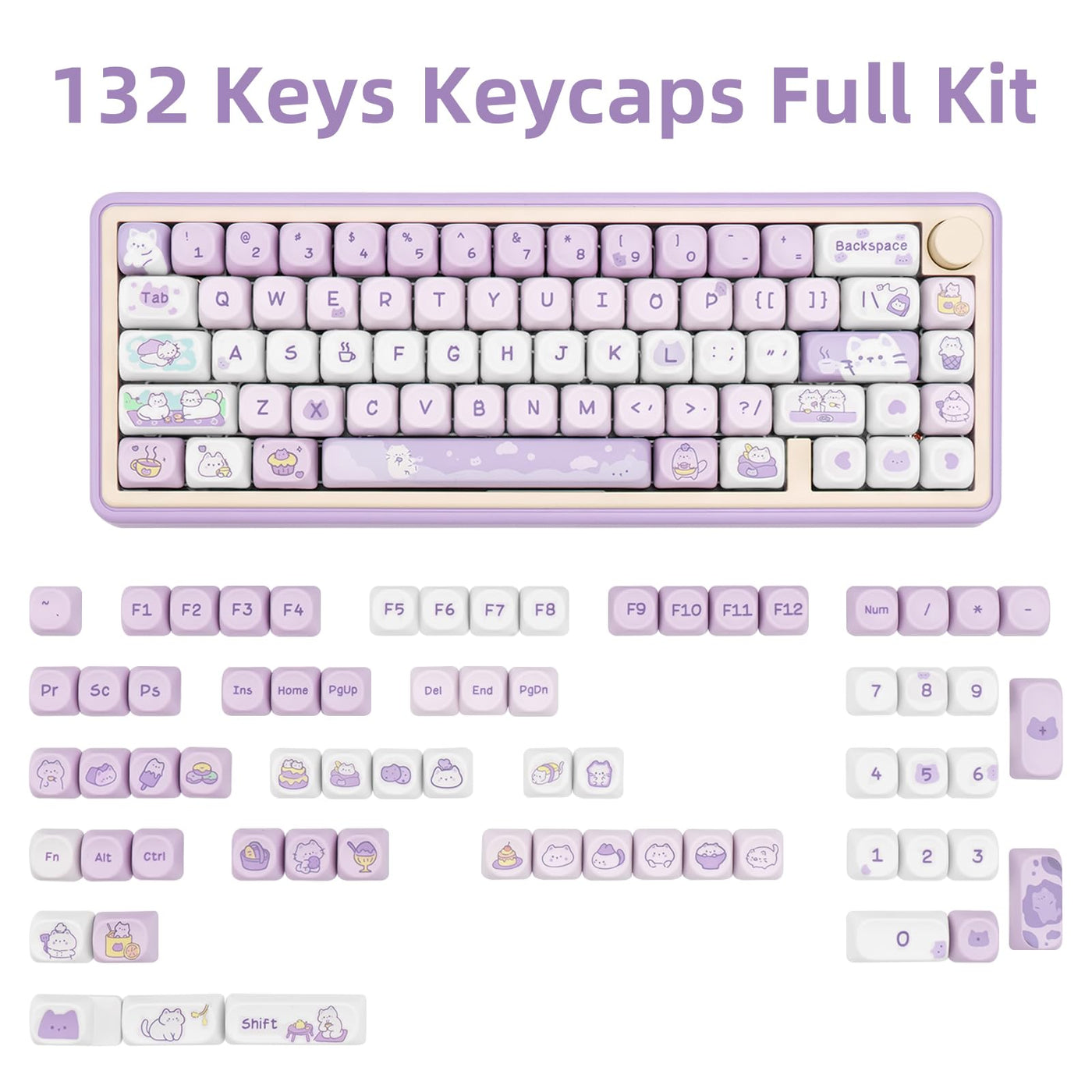 1.???Moa Profile Keycaps?Introducing The Moa Profile, Where Each Key Maintains A Consistent 40Mm Height, Ensuring A Seamless And Comfortable Typing Experience. All Keys, All Rolls, One Height. Uniformity At Its Finest.2.???Widely Compatible?132 Keys Pbt Keycaps Can Fit For 61/87/104/108/84/68/64 Mechanical Keyboard.3.???Dye-Sub Keycaps? With The Advanced Dye-Sublimation Process, The Cute Cat Designs And Vibrant Purple And White Hues On The Keycaps Are Not Just Surface-Level. They Are Embedded Deep Within, Ensuring They Remain Pristine And Fade-Resistant, No Matter How Intense Your.4.???Pbt Material?Composed Of High-Quality Pbt Material, The Purple Cat Keycaps Set Ensures Prolonged Durability And A Sublime Tactile Feel With Every Keystroke. Get Ready For A Typing Experience That'S Not Only Visually Delightful But Also Incredibly Satisfying To The Touch.5.???Diy Keycaps Set?Comprising 132 Keys, It Is Designed To Fit A Wide Range Of Mechanical Keyboards, Specifically Tailored For Mx Switches.