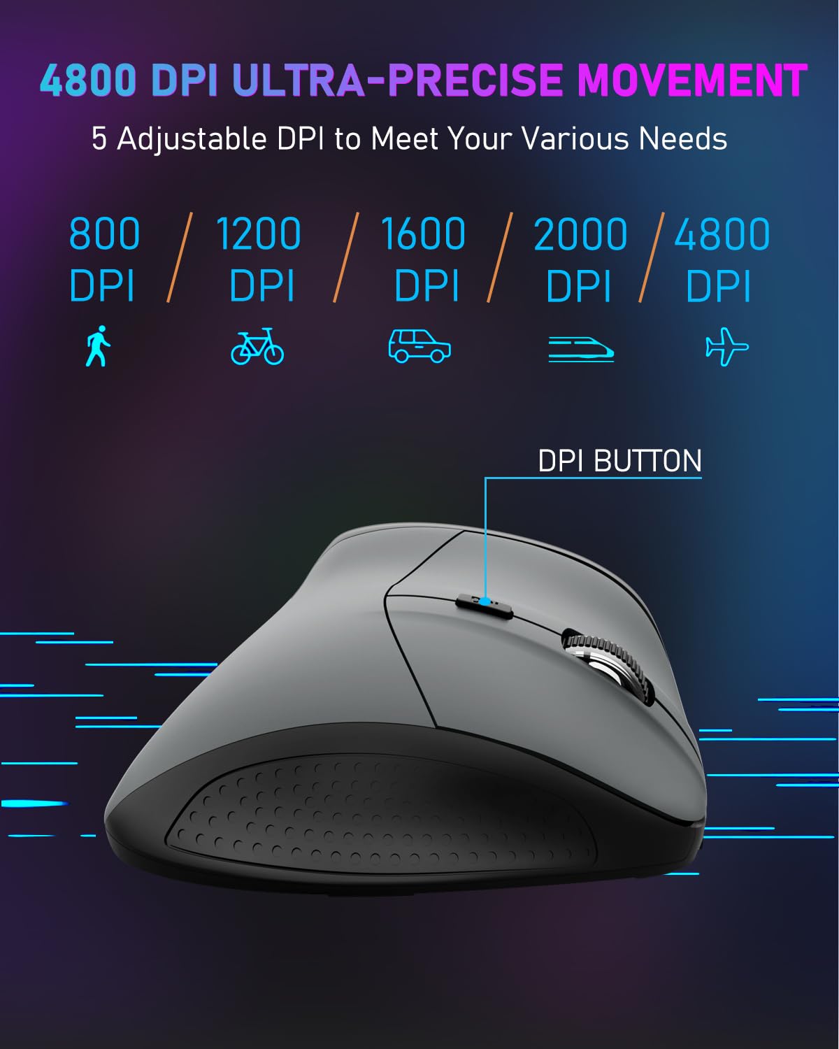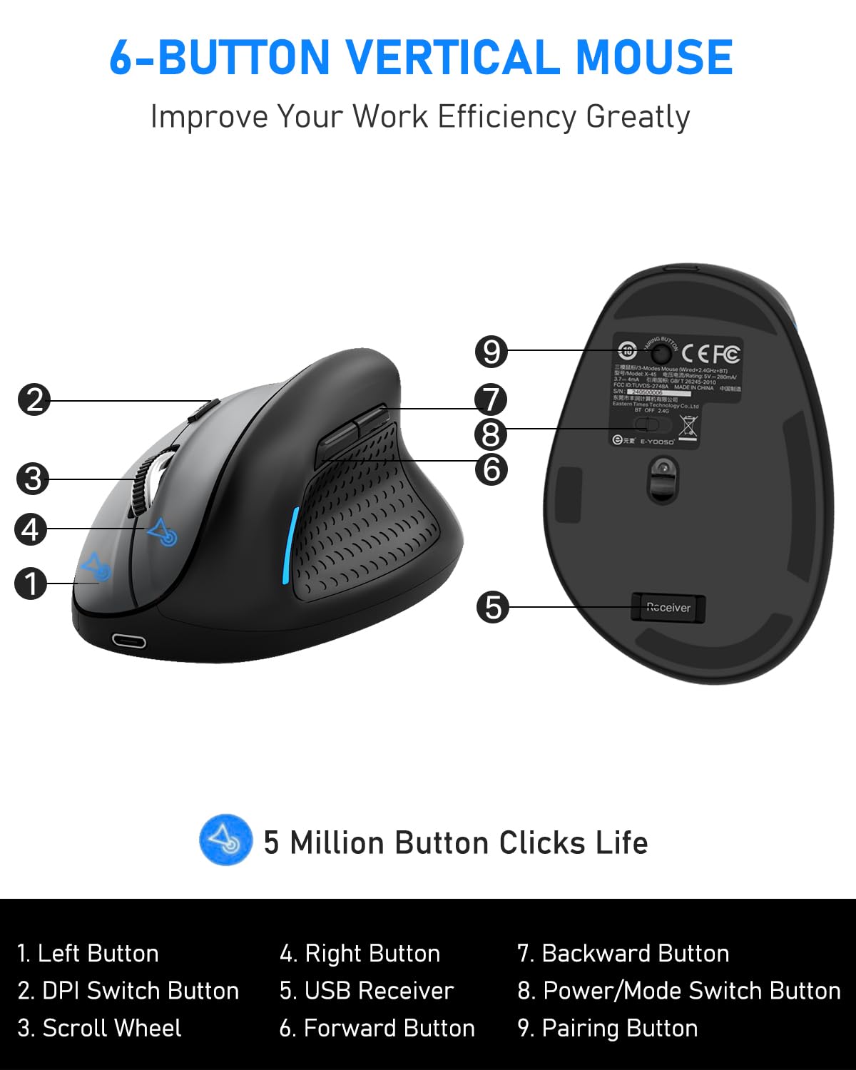 Ergonomic Mouse, E Yooso Wireless Vertical Mouse With 6 Buttons, 5 Adjustable Dpi Levels, Up To 4800 Dpi, 2.4G And Bluetooth Rec
