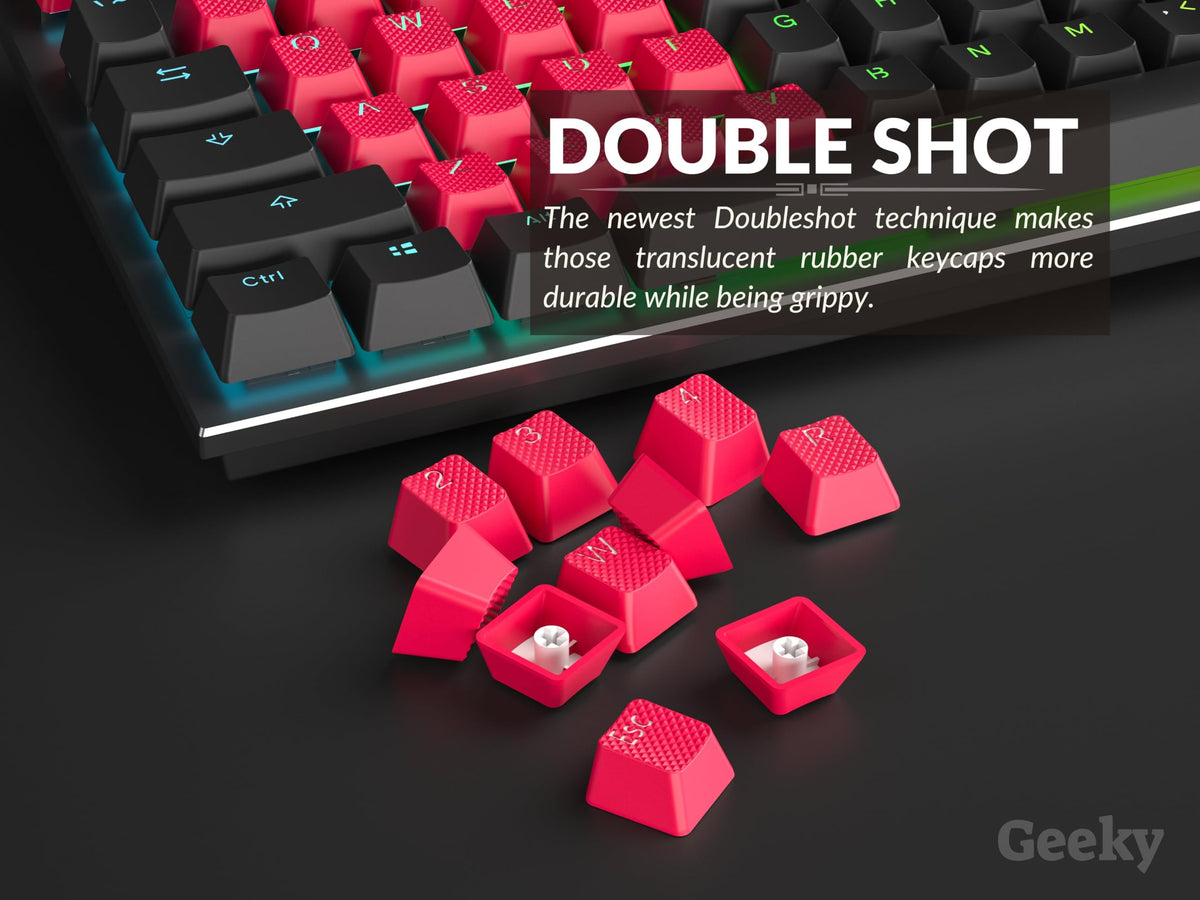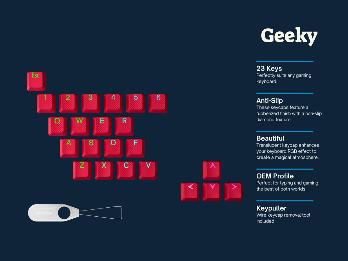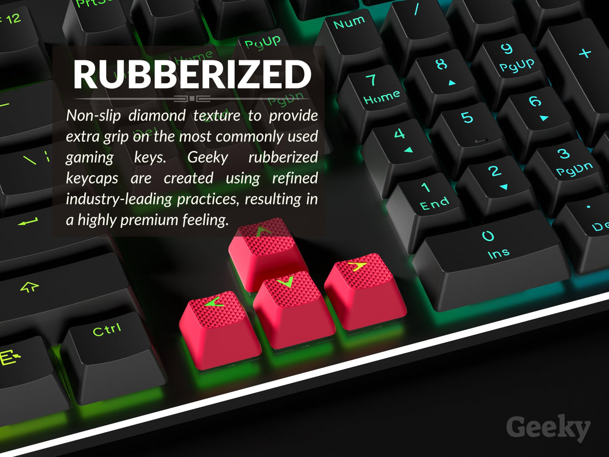 Geeky Rubberized Double Shot Keycaps Our Rubberized, Doubleshot, Shine-Through Keycaps Offer A Non-Slip Diamond Texture And Finish. Perfect For Gamers Seeking Additional Grip On Frequently Used Keys. Specifications: Material: Tpr + Abs Key Profile: Oem Compatible With: Cherry Mx, Gateron, Kailh, Kailh Box, Outemu, Lk Switches. Included Keys (23): Esc 1 , 2 , 3 , 4 , 5 , 6 Q , W , E , R A , S , D , F Z , X , C , V Arrow Keys ( X4) Package Contents: 23 Rubberized Keycaps Keycap Puller