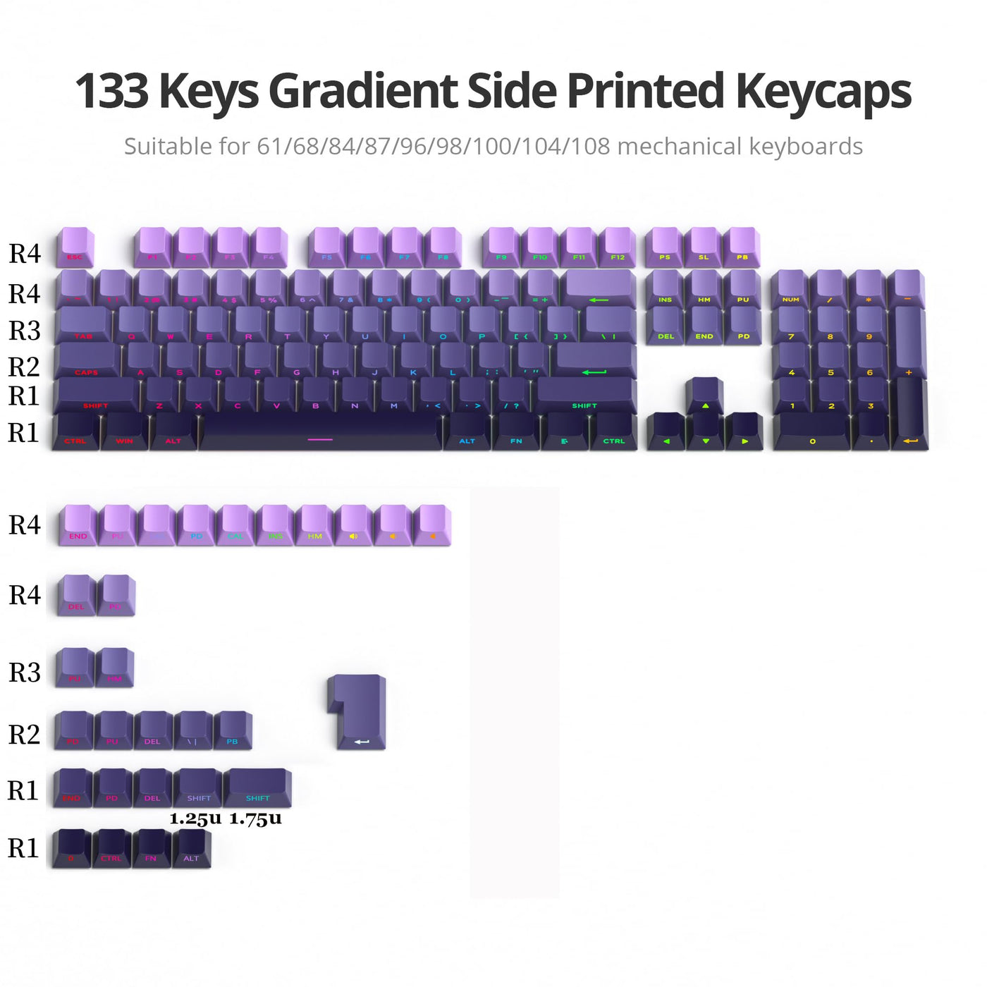 ?Gifts For Game Lovers?: Perfect For Kids, Teens, Friends' Gifts, An Ideal Choice For Keyboard Lovers, E-Players, Office Staff, Someone Who Like The Customized Keycaps.(Only Keycaps, The Keyboard Is Only For Display) ?Note?: This Keycap Can Be Used For 68 84 96 Layout Which Contain 1.75U Shift 1U Alt Fn Ctrl.If You Want To Use On 96 Layout,You Need To Use A Novelty Key To Put On R4 End Place Spce: Keys: 133-Keys Material:Pbt Profile: Cherry Profile Package Includes : Keycaps