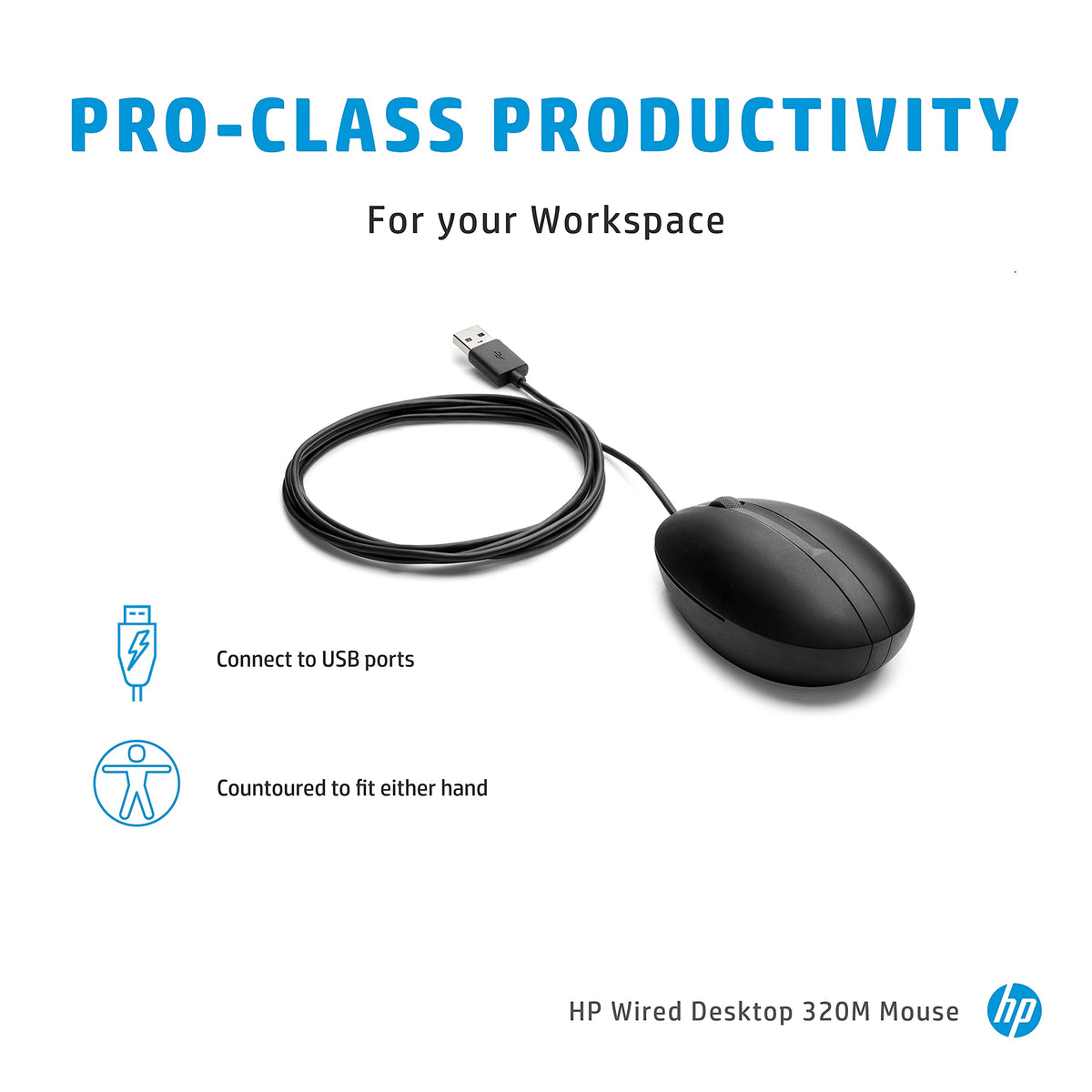 Pro-Class Productivity For Your Workspacework Efficiently And Enhance Your Everyday Productivity With The Comfortable, Reliable Hp Wired Desktop 320M Mouse.Designed For Your Comfortnavigate Your Documents Comfortably With A Contoured Mouse That Fits Either Hand.Easy To Connect And Useget Plug And Play Simplicity And Essential Design Features. Connect The Mouse To Any Available Usb Port On Your Laptop. The Mouse Wheel Doubles As A Third Function Button.Safe To Cleanfeel Good Knowing You Can Safely Clean Your Mouse With Everyday Disinfecting Wipes As Hp Mice Have Been Tested Up To 1,000 Wipes.Designed With The Environment In Mindmake A Purchase You Can Feel Good About With Printed Circuit Boards That Are Low Halogen.