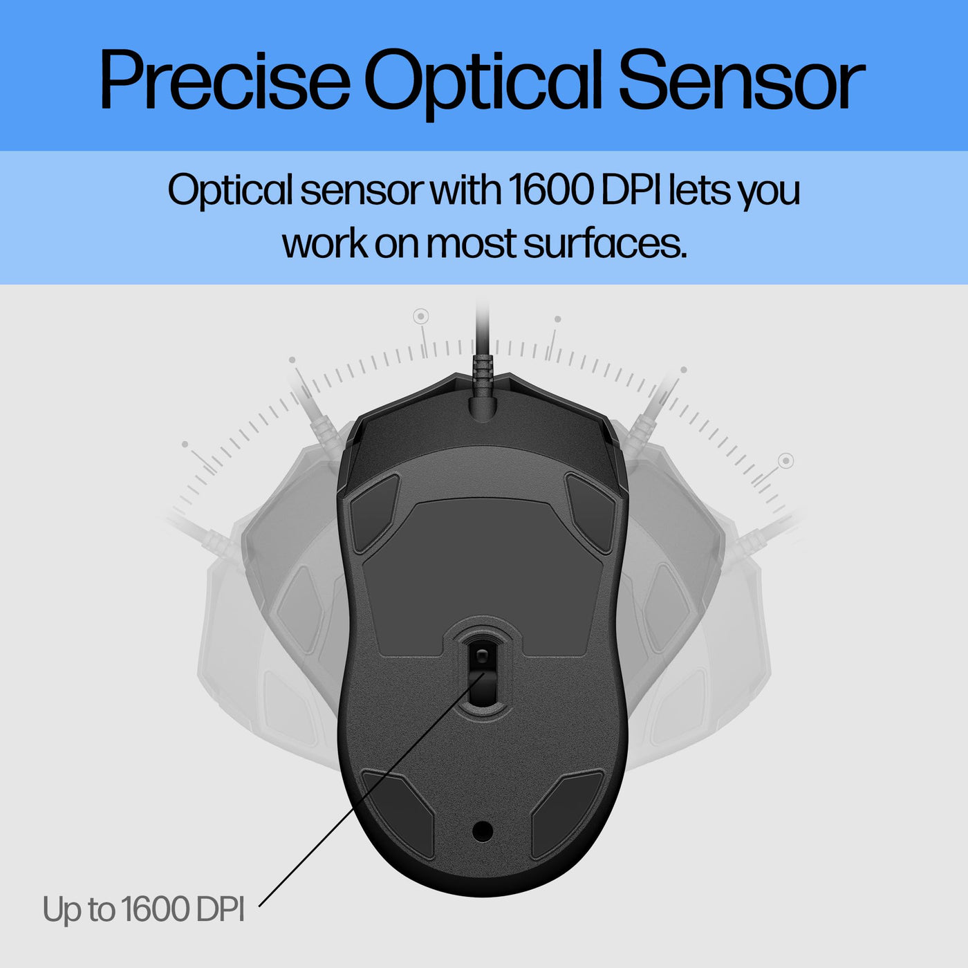 HP Wired Mouse 100 Precise Optical Sensor with 1600 DPI Easy USB Connection Ambidextrous Design 3 Button Control & Built in Scrolling Multi OS Compatible (6VY96AA#ABL)