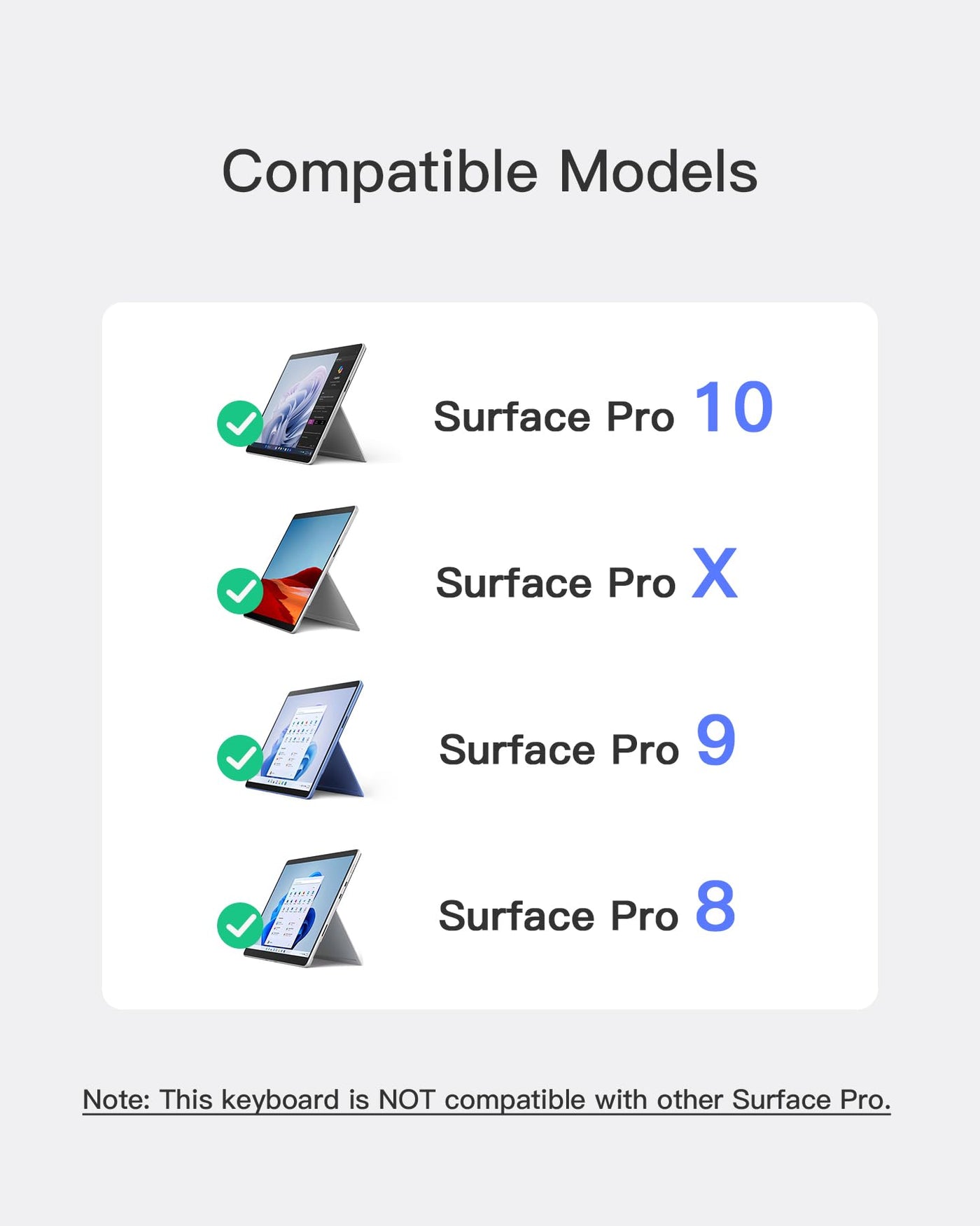 Supported Model: The Keyboard Is Specially Designed For Surface Pro 8, Surface Pro 9 And Surface Pro X(1St Gen/2Nd Gen/3Rd Gen). Please Note That This Is Not Compatible With Other Surface Pro. | Easy To Use: It Supports Bluetooth Swift Pair. Power It On And Then Your Device Will Show You A Notification For Pairing. Simply Click It To Complete The Connection. | 7 Color Backlight: The 7-Color Backlight With 3 Adjustable Levels Of Brightness Enhances The Visibility Of The Keyboard Whether You'Re In The Bedroom, On A Plane, Or Any Other Low Light Environment. | Advanced Keys: This Keyboard Ensures Short Key Travel As Well As Stable, Fast And Quiet Typing. | Precise Control: With A Laptop-Like Trackpad, This Keyboard Supports Multi-Touch Gestures And Palm Rejection.