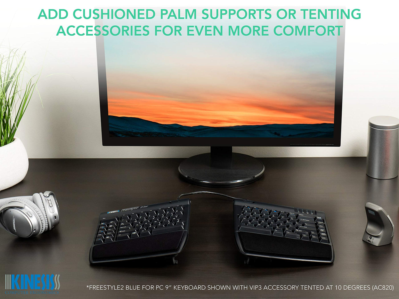 Q: What accessories are compatible with the KINESIS Freestyle2 keyboard?A: The Freestyle2 keyboard is compatible with several accessories, including Palm Supports for wrist comfort, as well as VIP3 and V3 Lifters that attach to the base of the keyboard, offering adjustable tenting angles of 5, 10, or 15 degrees to further enhance ergonomic posture.