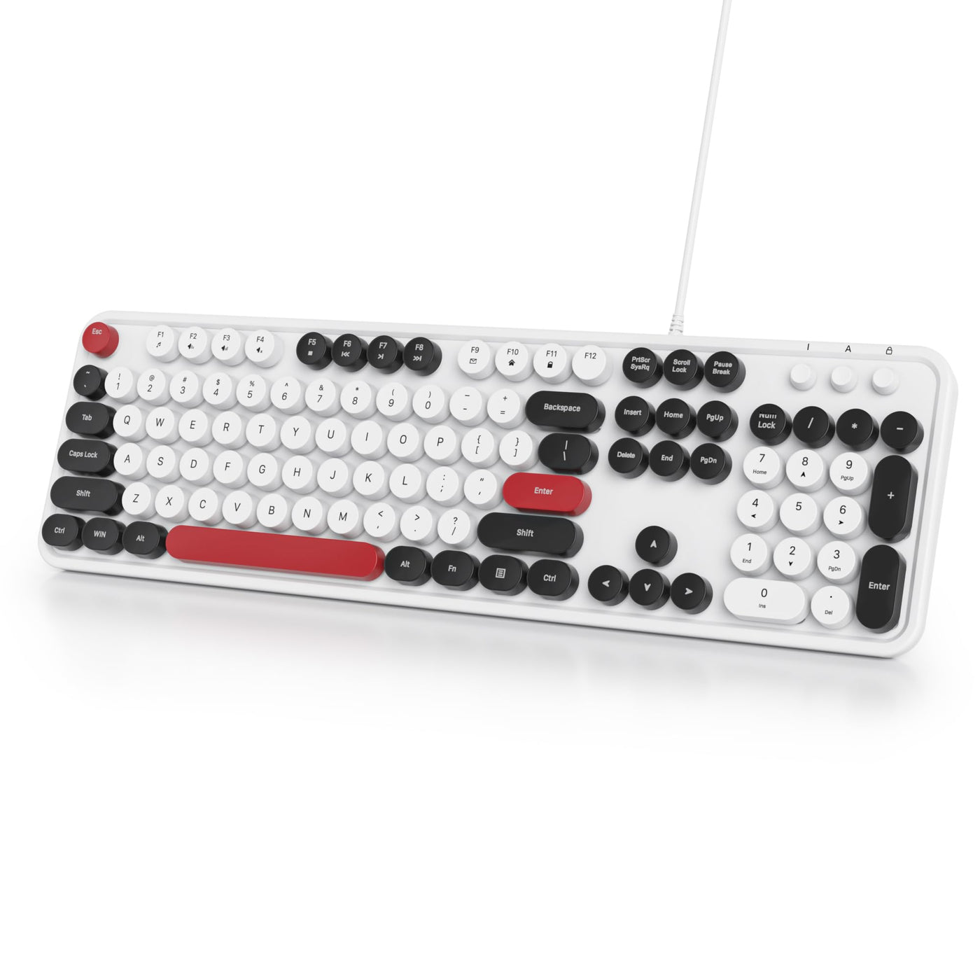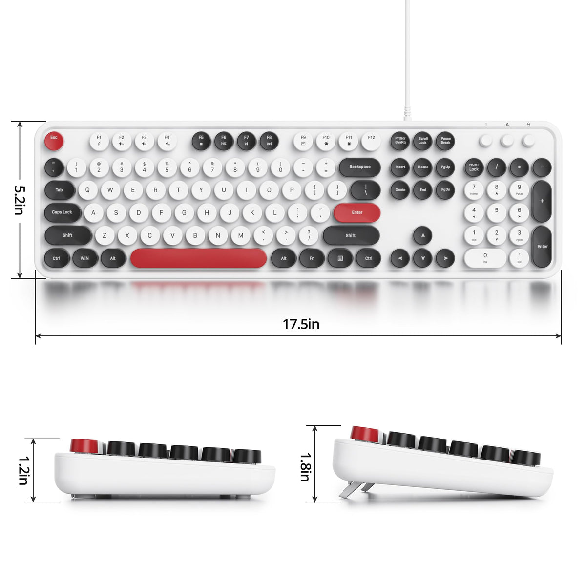 The Classic Typewriter Style Is Integrate With Modern Style Keyboard Technology. Responsive And Incredibly Supportive, All Interactions Are Positive, And Enjoy The ''Click''Feeling By The Old Royal Typewriter, So You Can Type With Confidence. ?104 Keys Layout And Anti-Slip Design- Full-Sized Wired Typewriter Keyboard Is Ergonomically Designed With And Foldable Stand That Can Make It Typing More Comfortable. Anti-Slip Design On The Bottom Of The Keyboard Can Prevent The Keyboard From Moving While Typing, Which Is More Stable To Use. ?Plug & Play And Stable Connection- This Wired Keyboard Is Plug And Play, No Needed Install Any Drivers, More Responsive Typing. ?12 Multimedia Shortcuts- The Wired Keyboard Has 12 Multimedia Shortcuts Combinations That Is Convenient To Instant Access Music, Volume, Computer, Mail, Etc. It Can Improve Work Efficiency Greatly. ?Note: There Are Caps Lock Indicator And Number Lock Indicator In The Upper Right Corner Of The Keyboard. (Some Multimedia Function Are Not Available With Mac Os)