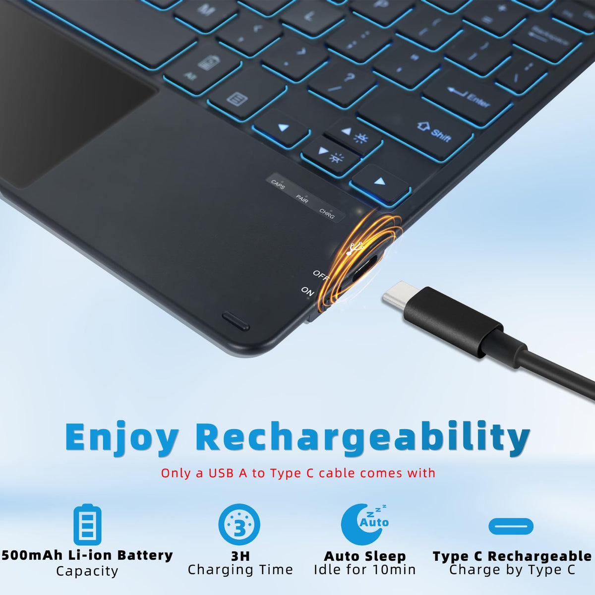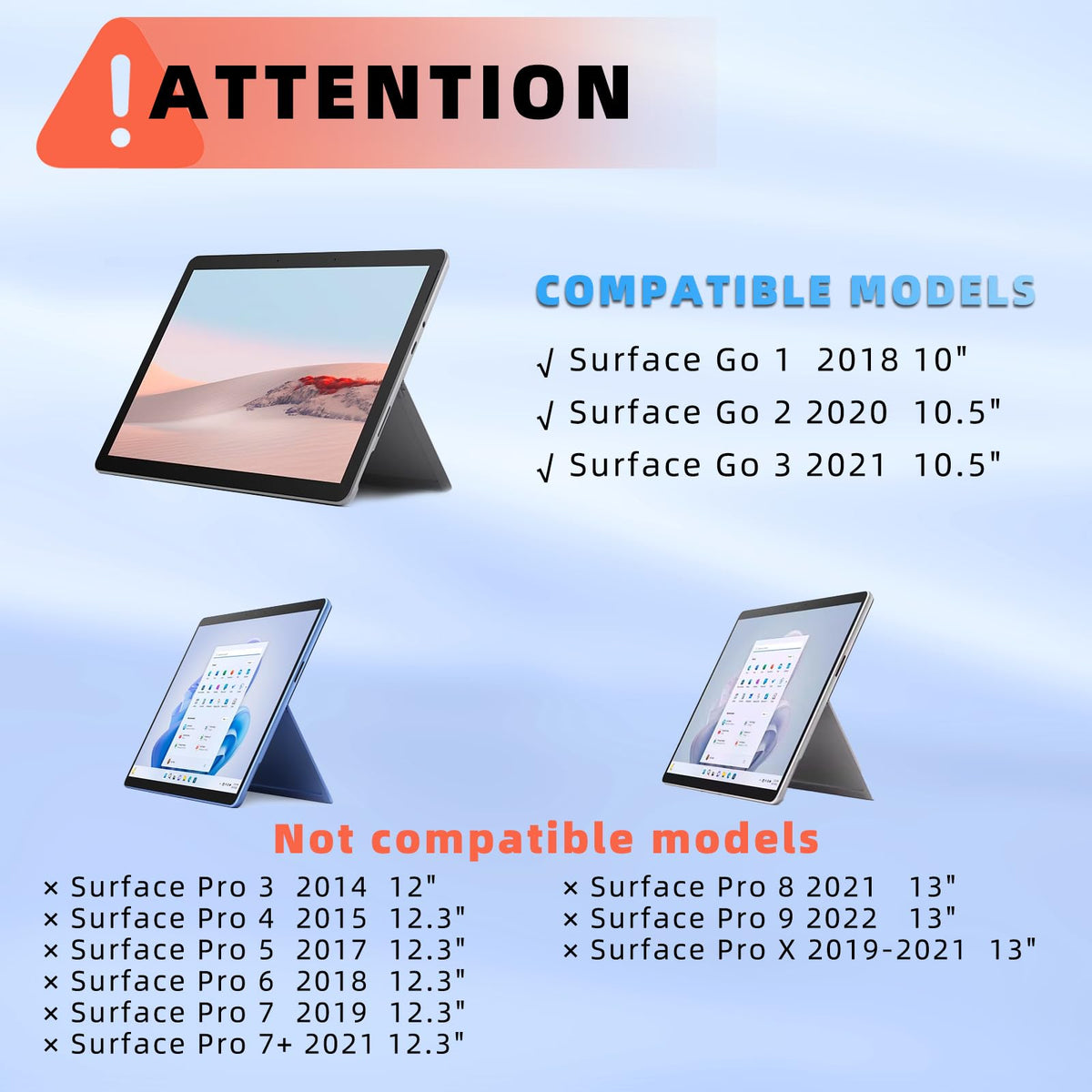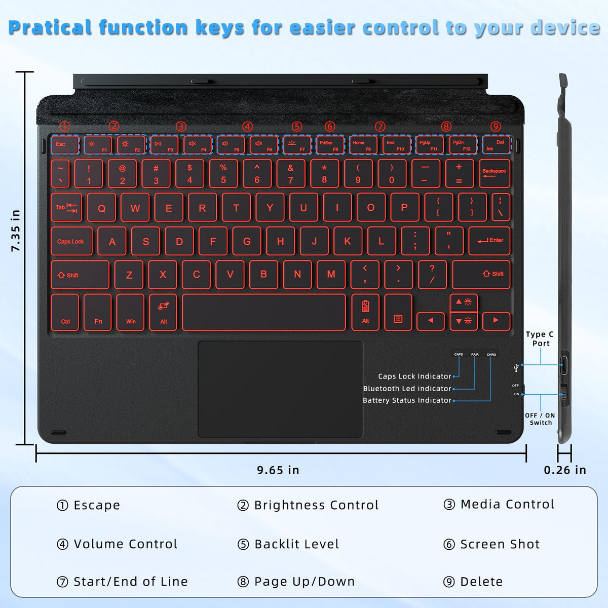 Descriptions: Perfect Fit For Surface Go 3/2/1 Easily Connected By Bt. 7 Color Elegant Led Backlight With 3 Brightness Level. Lightweight. Type C Charging. Extra-Large Touchpad. Adjusts Instantly. How To Connect The Keyboard? 1. Push The Power Switch Button To On Position To Turn On The Keyboard. (Chrg Light Shows Red And Turns On For 3 Second, Then Turns Off) 2. Press ''Fn'' Plus ''C'' At The Same Time, The Bluetooth Of The Keyboard Will Turn On. 3. Turn On The Bluetooth Of Your Surface, Then Search ''Bluetooh Keyboard'' For The Device, Choose Bluetooth Keyboard'' Option In The Searching Page To Adapt. 4. Connection Succeeded. Package Includes: 1 X Keyboard Case For Surface Go 3/2/1 1 X Type-C Charging Cable (No Charger) 1 X Keyboard Manual