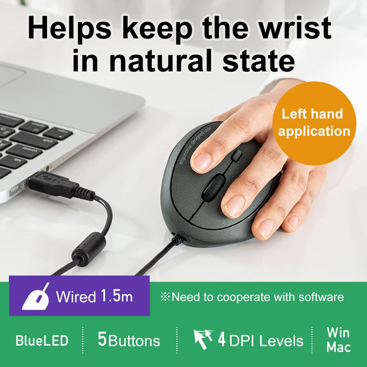 Sanwa Wired Left Handed Ergonomic Mouse, Optical Vertical Mice, For Small Hands, Reduce Wrist Strain,1000/1600/2400/3200 Adjustable Dpi, 6 Buttons, Compatible With Laptop, Desktop, Windows, Mac,Black
