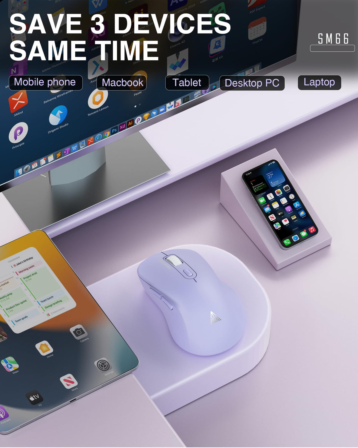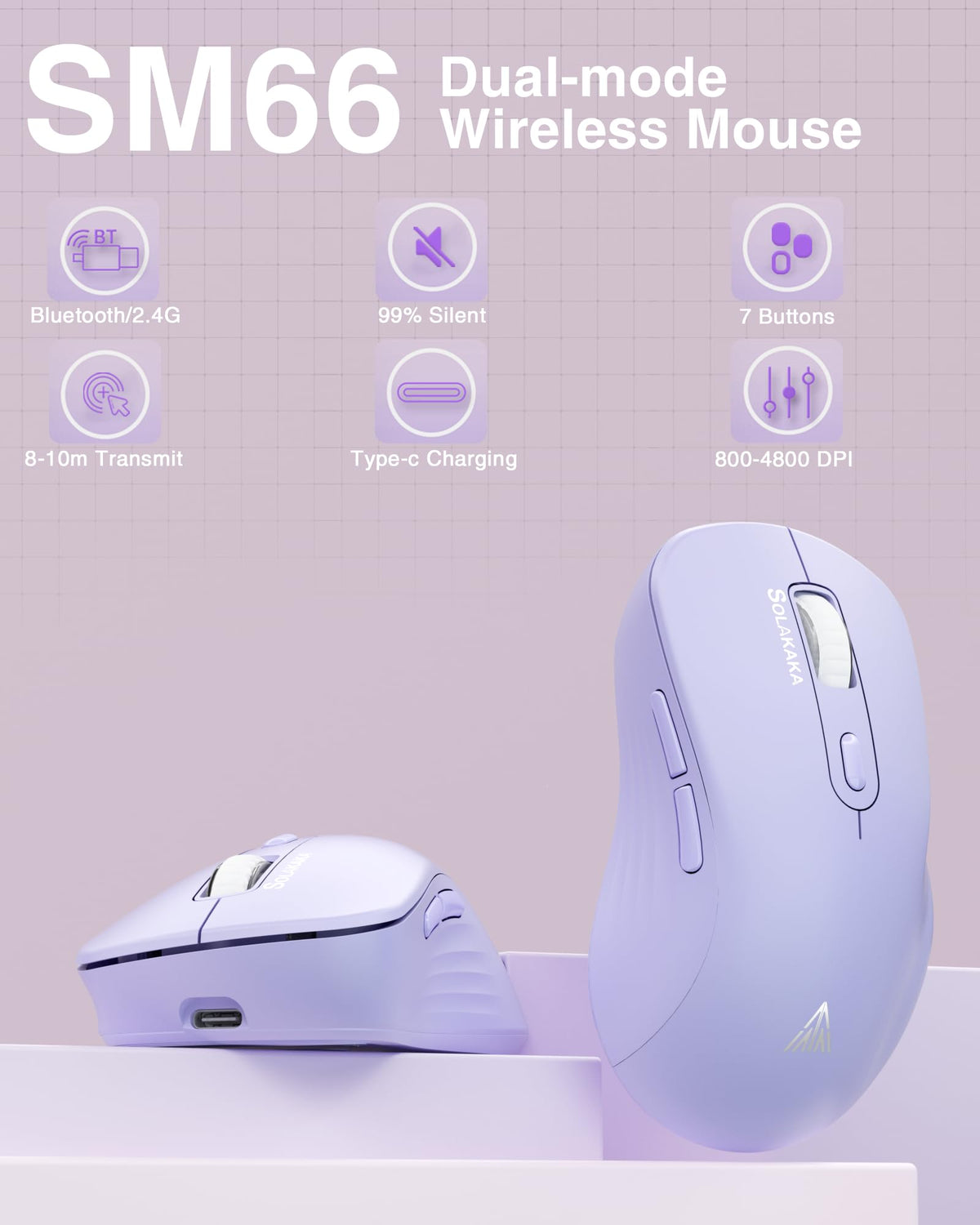 Solakaka Sm66 Purple Silent Dual Mode Wireless Mouse For Laptop, Adjustable 4800 Dpi,Rechargeable Computer Mouse For Bluetooth A
