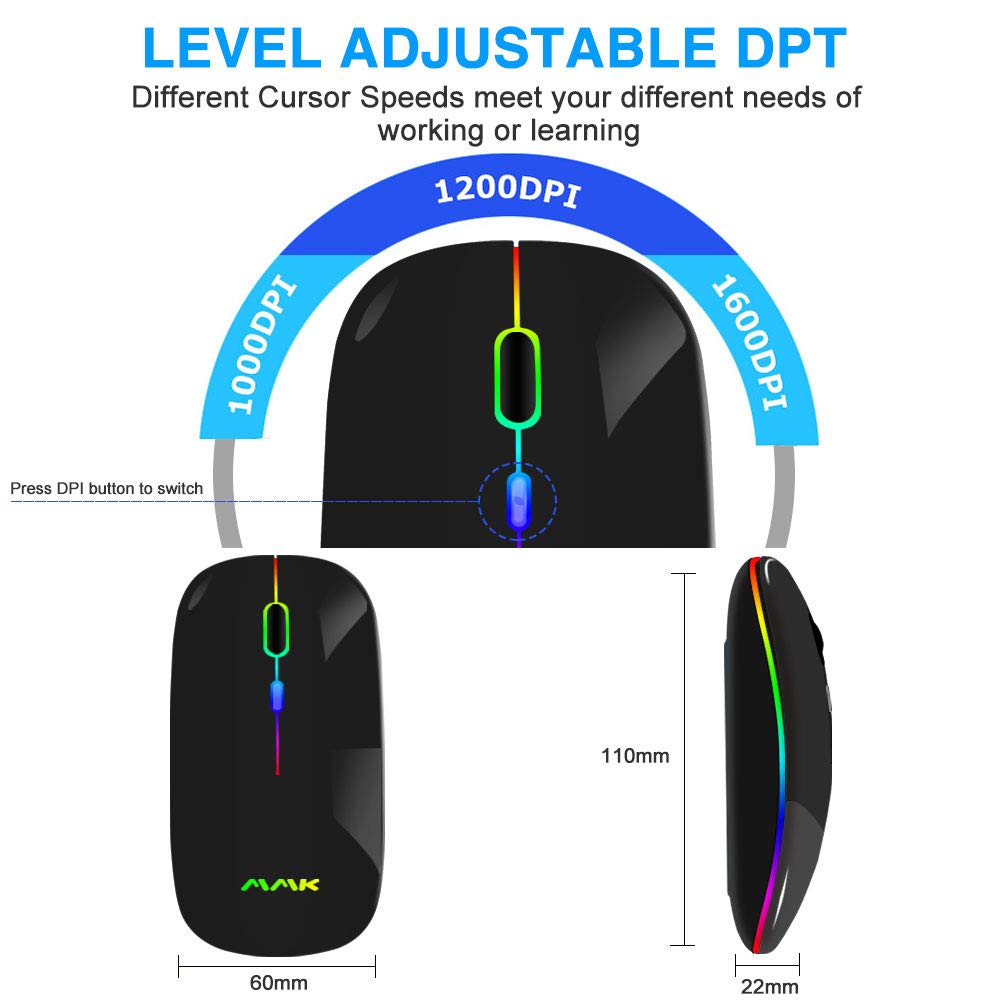 Bluetooth Mouse, Wireless Mouse Multi-Device Slim Rechargeable Bluetooth Wireless Mouse (3-Mode: Bt 5.0+2.4G), 1600Dpi Portable Mouse For Ipad Macbook Laptop Android Tablet Windows Pc 2.4G Wireless Technology Features Advanced 2.4G Wireless Technology That Ensures Reliable Connection Up To 33Ft. Portable & Compact Size If You Travel A Lot For Work, This Lovely Mouse Would Be The Best Partner For Your Trip, As The Compact Design, It Can Be Easily Put Into Your Bag. Plug & Play Super Easy Installation No Other Drivers Or Codes Needed.Just Plug The Usb Receiver To Your Computers Usb Port,Then You Are Ready To Go. Low Power Consumption Wireless Mouse Has Adjustable 3 Levels Dpi: 1000- 1200- 1600. It Will Turn To Sleep Mode In 10Mins Of Inactivity For Energy Saving, And Can Be Activated By Clicking Any Button. Package Include: 1 * Wireless 2.4G Mouse(Aaa Battery) 1 * Usb Receiver 1 * User Manual 1 * Data Line 1 * Warranty Card Customer Service: We Provides You 24-Hour Email Contact Service & A Free Lifetime Technical Support If You Received Defective Products Or Have Any Questions With This Wireless Mouse.