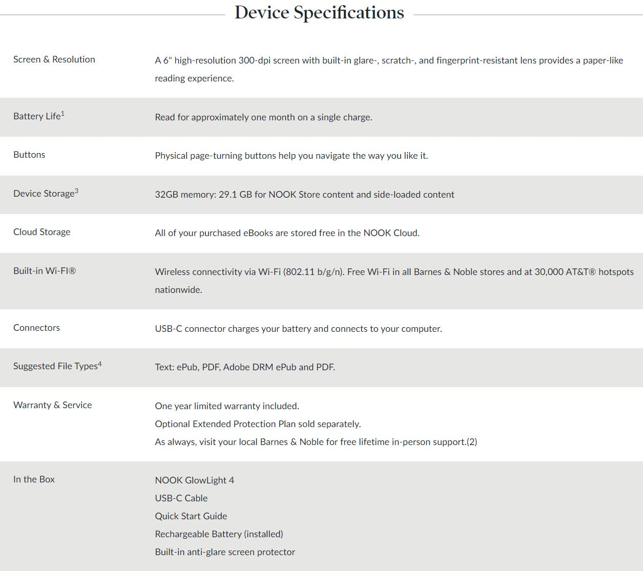 Q: What type of materials are used in the Nook Glowlight 4?A: The Nook Glowlight 4 is designed with a soft-touch finish for easy gripping and comfort during long reading sessions, while also featuring a lens that is glare, scratch, and fingerprint-resistant.
