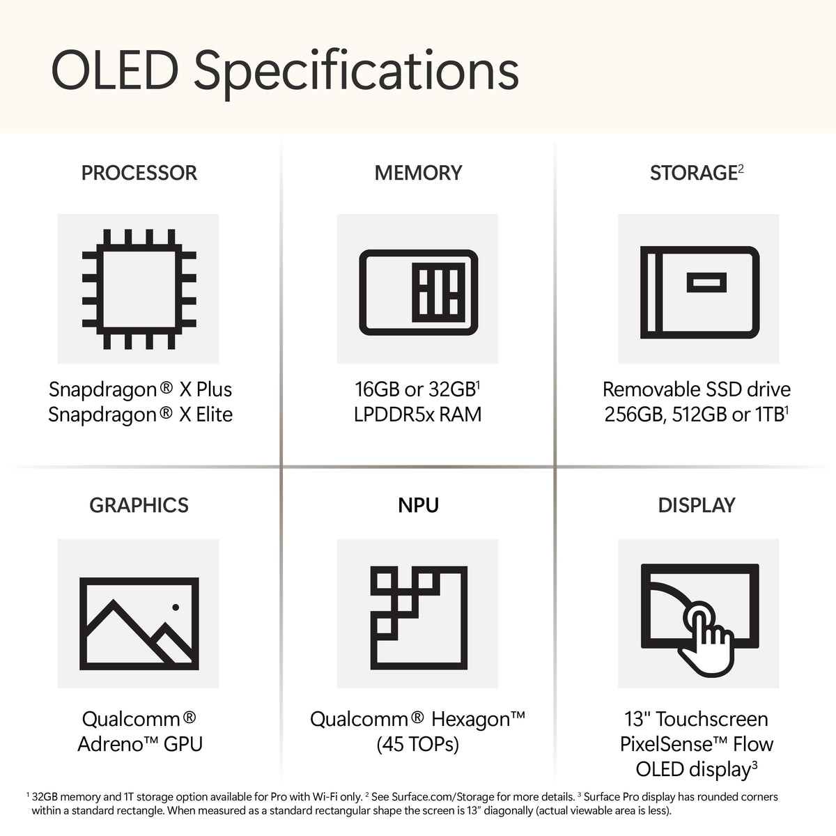 * Some Copilot+ Pcs Require Download Of Free Updates To Run Copilot+ Pc Experiences, Available Starting Late 2024 - 2025. See Https://Aka.Ms/Copilotpluspcs ** Pre-Release Screen Shown; Subject To Change. *** Availability Of Copilot+ Pc Features Varies By Device And Market. [1] Based On Cinebench 2024 Multi-Threaded Conducted By Microsoft In April 2024 Comparing Pre-Release Build Of Surface Torrance With Snapdragon X Elite Running Pre-Release Windows 11 26100 And Apple Macbook Air 13'' With M3 Running Macos 14 Sonoma. [2] Optimized For Select Languages (English, Chinese (Simplified), French, German, Japanese, And Spanish. Content-Based And Storage Limitations Apply. See Https://Aka.Ms/Copilotpluspcs [3] 6Ghz Band Not Available In All Regions. [4] Options With 5G Coming Later In 2024. 5G Not Available In All Areas; Compatibility And Performance Depends On Carrier Network, Plan And Other Factors. See Carrier For Details And Pricing. [5] Battery Life Varies Significantly Based On Usage, Network And Feature Configuration, Signal Strength, Settings, And Other Factors. See Https://Aka.Ms/Surfacebatteryperformance For Details. [6] Available Colors May Vary By Market. [7] Currently Supports Translation For Video And Audio Subtitles Into English From 40+ Languages. See Https://Aka.Ms/Copilotpluspcs [8] Hdr Requires Hdr Content And Enabling Hdr In Device Settings. [9] Supporting 3 External Displays Requires Either 2 Displays Connected To A Compatible Dock Or Connected Through Daisy Chain. [10] Detached Use Requires Windows 11. [11] Usb-C Port Does Not Charge Your Surface Device Or Any Device That Requires More Than 15W [12] Requires Device With Usb-C Usb4/Thunderbolt 4 Port And When Supported By Device And Display.