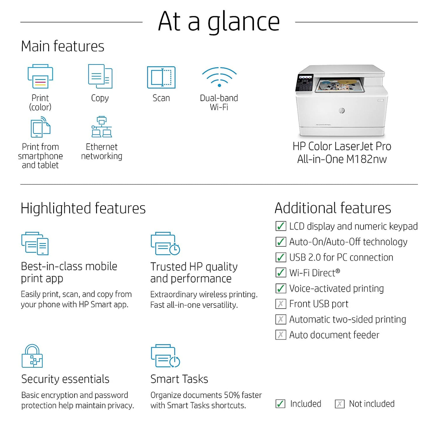 Get Extraordinary, Wireless Performance And Fast Multifunction Versatility With The Hp Color Laserjet Pro M182Nw Wireless All-In-One Laser Printer. This Color Laser Printer Lets You Easily Print And Scan From Your Mobile Device With Hp Smart, Hp'S Best-In-Class Mobile Print App; Plus, Automate Repetitive Tasks And Organize Documents 50% Faster With Exclusive Office Features In The Hp Smart App. Breeze Through Tasks With Print, Scan, And Copy Capabilities, Print Speeds Up To 17 Ppm, And A First Page Out Time As Fast As 11.6 Seconds. Count On Seamless Connections With This Hp Laserjet Printer'S Dual-Band Wi-Fi, And Security Essentials That Help Maintain Privacy And Control.