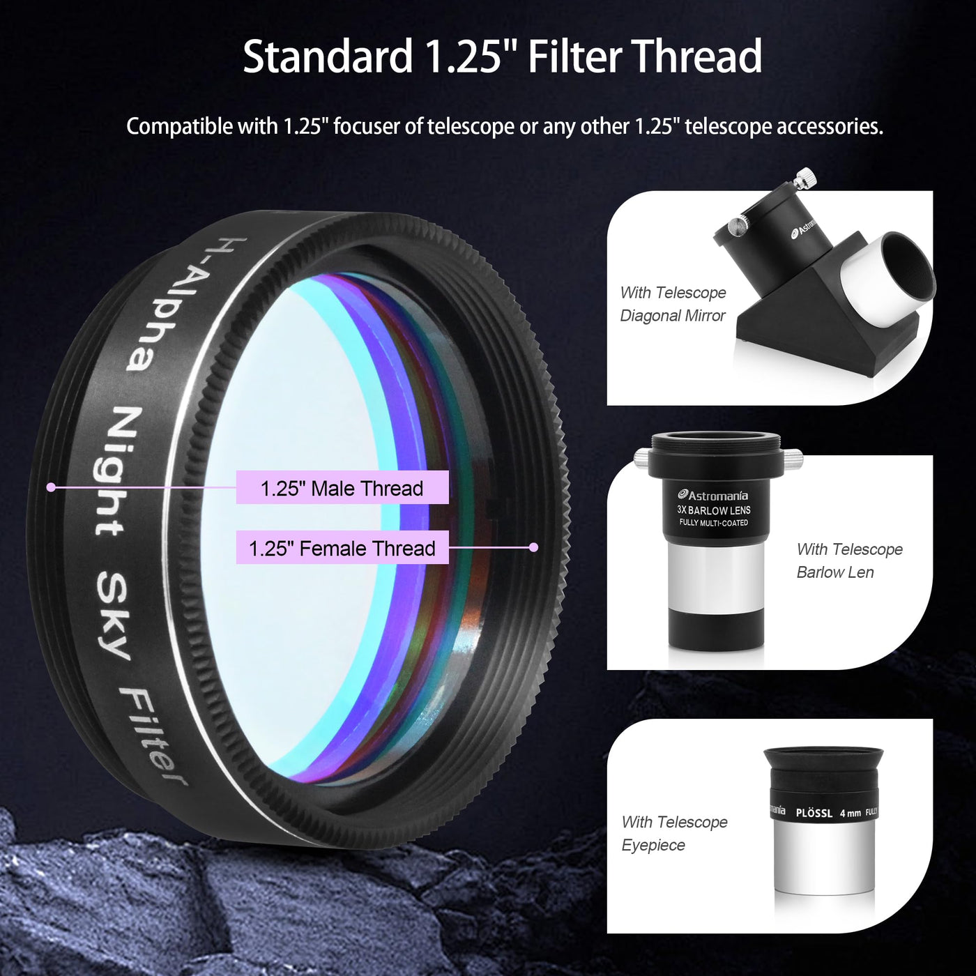 Q: Is the H-Alpha filter compatible with standard 1.25" telescopes?A: Yes, the Astromania H-Alpha filter is designed to thread into the nose-piece of industry-standard 1.25" Digital Imagers, making it compatible with most 1.25" telescopes and imaging devices.