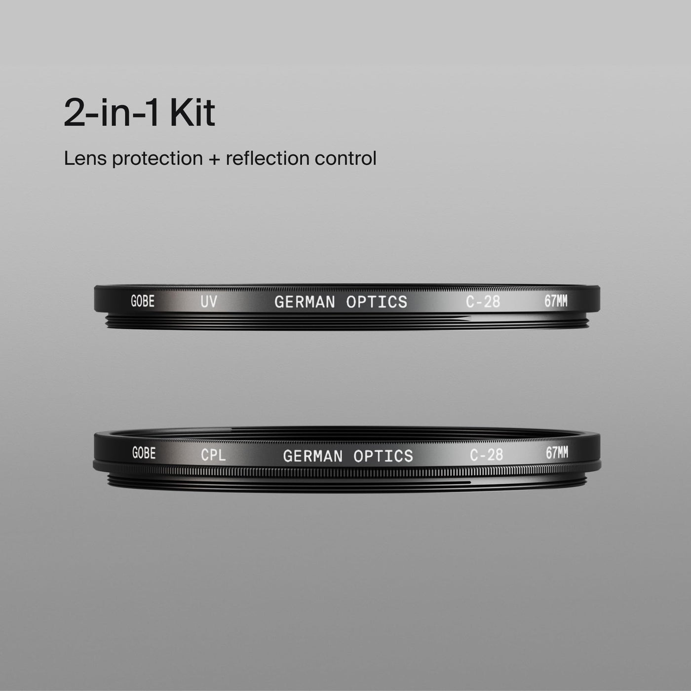 This Gobe Duet Filter Kit Pro Includes Our Uv Lens Filter Pro Which Cuts 99.6% Of Ultraviolet Light To Sharpen Your Photos And Protect It From Scratches, Oil, Dirt, Fingerprints, And Saltwater. It Also Includes Our Cpl Lens Filter Pro Which Cuts 99.9% Of Reflected Light For Better Contrast And Stronger Colour Saturation. The Gobe Pro Range Features 28 Layers Of Nano-Coating Providing Easier Cleaning And Better Protection Against Water, Oil, And Scratches. These Layers Also Provide A Higher Maximum Light Transmission And A More Consistent Transmission Curve For Sharper Images, Finer Colours, And Greater Depth.