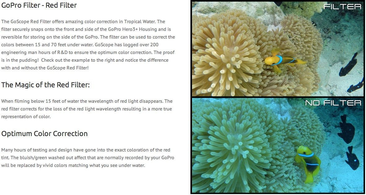 The Goscope Red Filter Offers Amazing Color Correction In Tropical Water. The Filter Securely Snaps Onto Your Camera. The Filter Can Be Used To Correct The Colors Between 15 And 90 Feet Under Water. Goscope Has Logged Over 200 Engineering Man Hours Of R&D To Ensure The Optimum Color Correction. Check Out The Example Pictures And Notice The Difference With And Without The Goscope Red Filter! The Magic Of The Red Filter: When Filming Below 15 Feet Of Water The Wavelength Of Red Light Disappears. The Red Filter Corrects For The Loss Of The Red Light Wavelength Resulting In A More True Representation Of Color. Optimum Color Correction Many Hours Of Testing And Design Have Gone Into The Exact Coloration Of The Red Tint. The Bluish/Green Washed Out Affect That Are Normally Recorded By Your Action Camera Will Be Replaced By Vivid Colors Matching What You See Under Water.