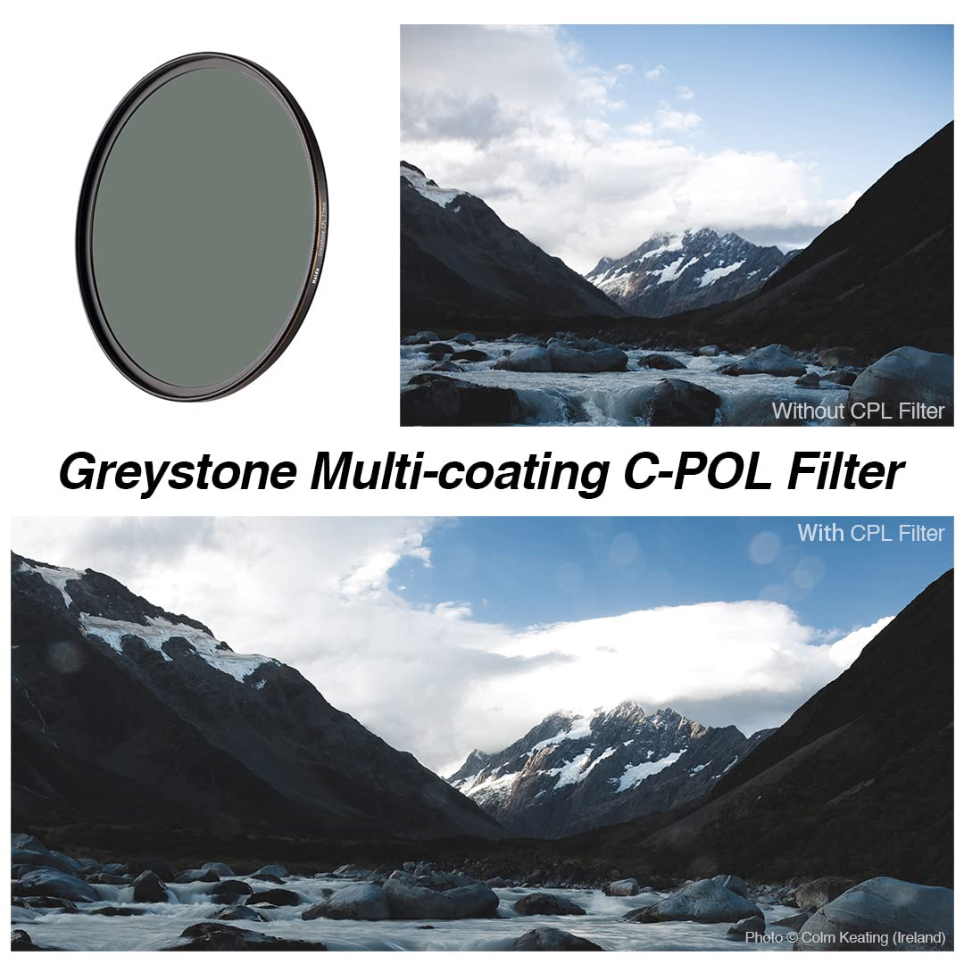 Improved Image:The Cpl Filter Helps To Reduce Reflections And Glare By Filtering Out Light That Has Become Polarized Due To Reflection From A Non-Metallic Surface. A Polarizing Filter Arranges And Filters Directionally Polarized Light Perpendicularly To The Reflected Light, Allowing For The Absorption Of Much Of This Light. This Results In A Noticeable Reduction Of Glare And Reflections From Non-Metallic Surfaces And An Increase In The Saturation Of Skies And Foliage. | Ultra Slim: To Prevent Internal Ghosting And Reflections, The Glass Includes 10 Layers Of Anti-Reflection Coating. These Coatings Also Offer Greater Protection To The Filter Substrate And Helps It To Stay Clean For Longer Than With Uncoated Filters. | Circular Polarizer:Circular Polarizers Are Ideal For Use With Digital Cameras And Autofocus Lenses Where A Linear Polarizer Will Often Disrupt Auto Exposure And Focus Features. 2.5X Filter Factor Reduces Exposure By 1.3 Stops. | Optics Glass:This Polarising Filter Is Constructed From Optical Glass For Clarity As Well As Color Fidelity And Features An Aluminum-Alloy Filter Ring That Can Be Rotated In Order To Adjust The Intensity Of The Polarization Effect. | Easy Installation:The Filter Ring Can Be Rotated To Adjust The Intensity Of The Polarization Effect.Strongest Effect When Used At A 90